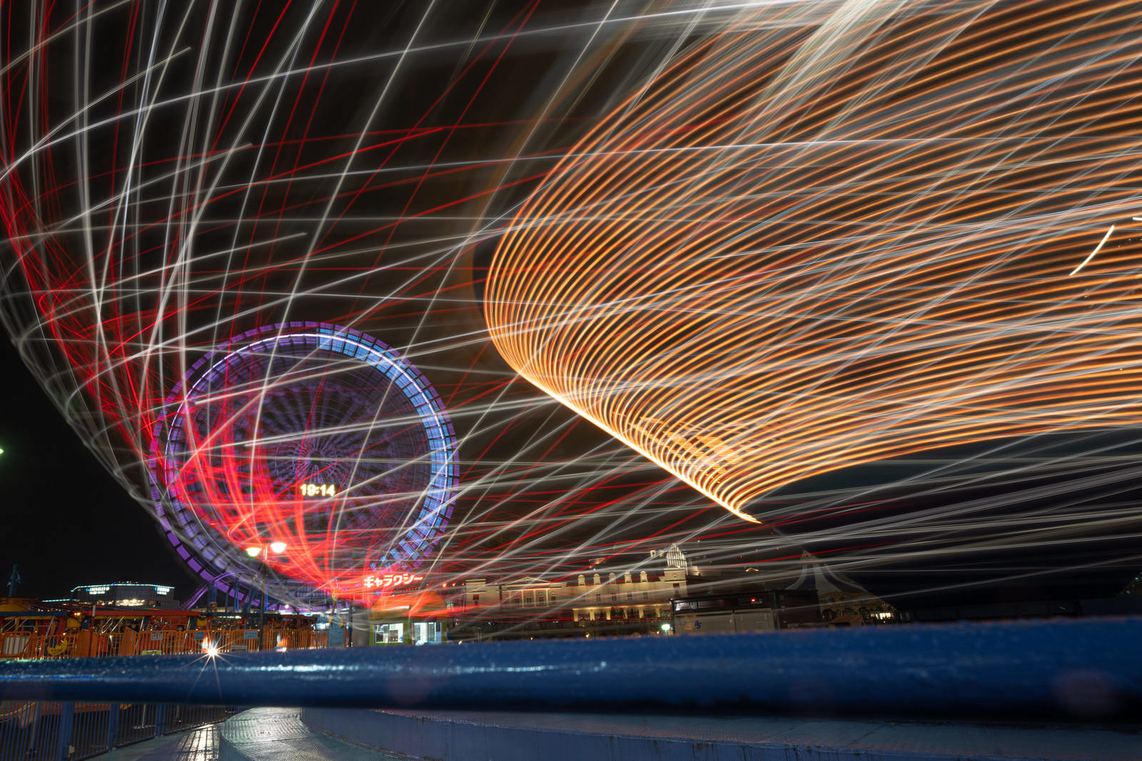 コスモワールドのスーパープラネットを長時間露光で撮影した夜景の写真素材です。赤、白、橙色の光跡が放射状に流れ、観覧車と周辺施設の照明がフレーム内に映り込んでいます。夜間観光地の演出、旅行記事やポスター、都市風景のビジュアルコンテンツなど幅広い用途にご活用いただけます。