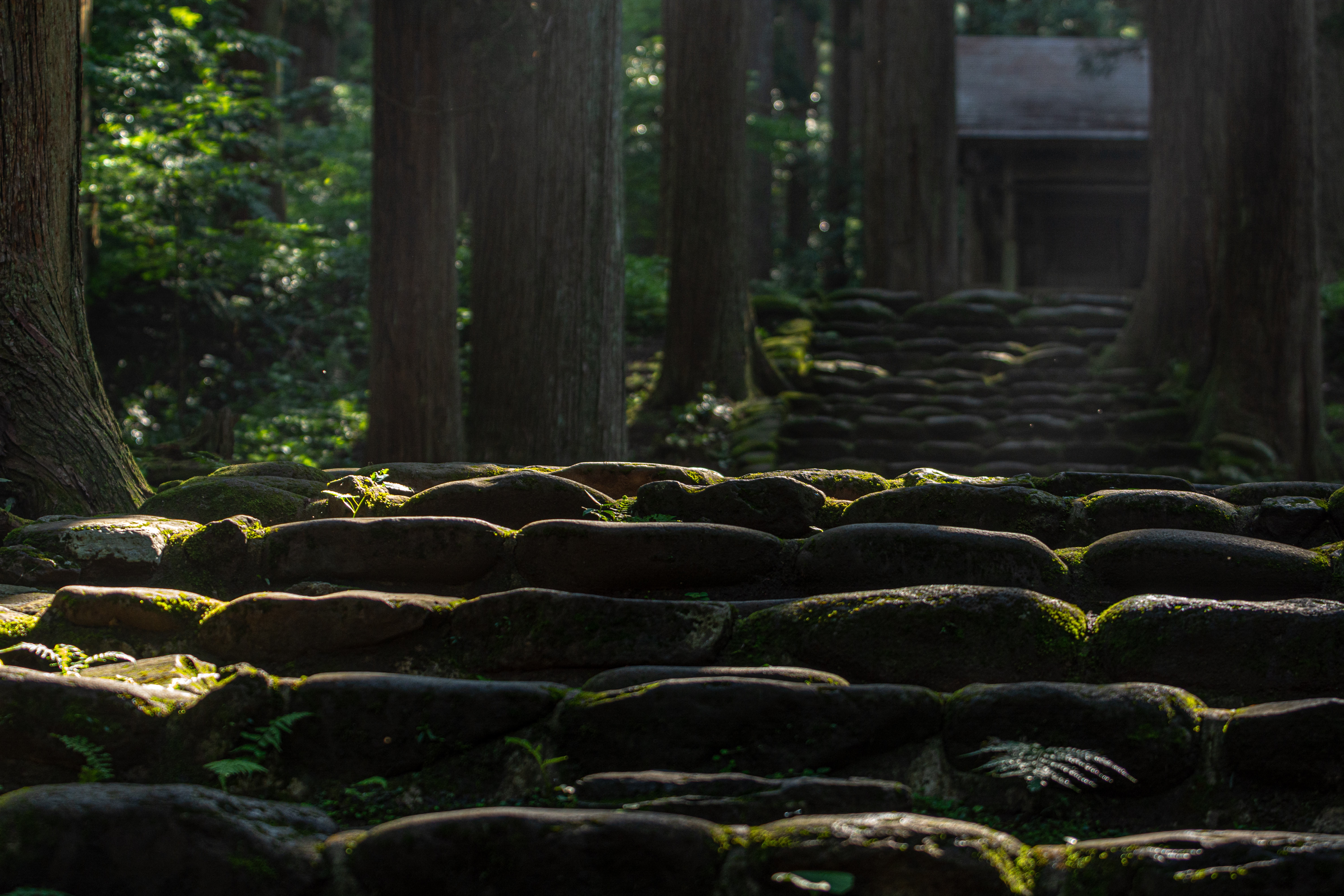 平泉寺白山神社の参道に続く石段の写真素材です。杉の大木が立ち並ぶ林床から差し込む陽光が石段を照らし、木漏れ日による明るい部分と暗い部分が交互に続いており、石段の表面には苔が生えています。神社や寺院、境内の風景、日本の歴史的建造物の紹介などに最適です。