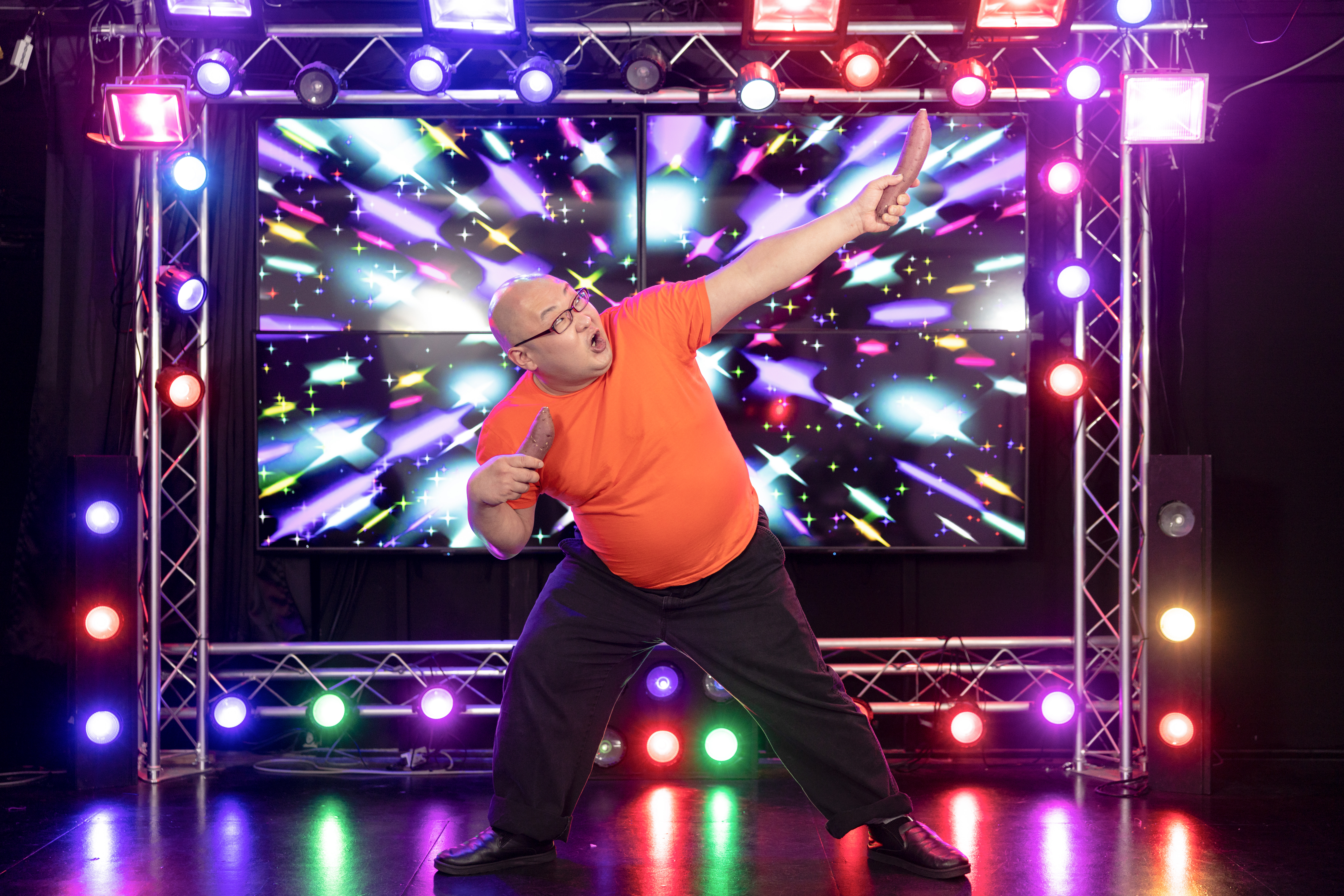 Man performing otaku dance on stage
