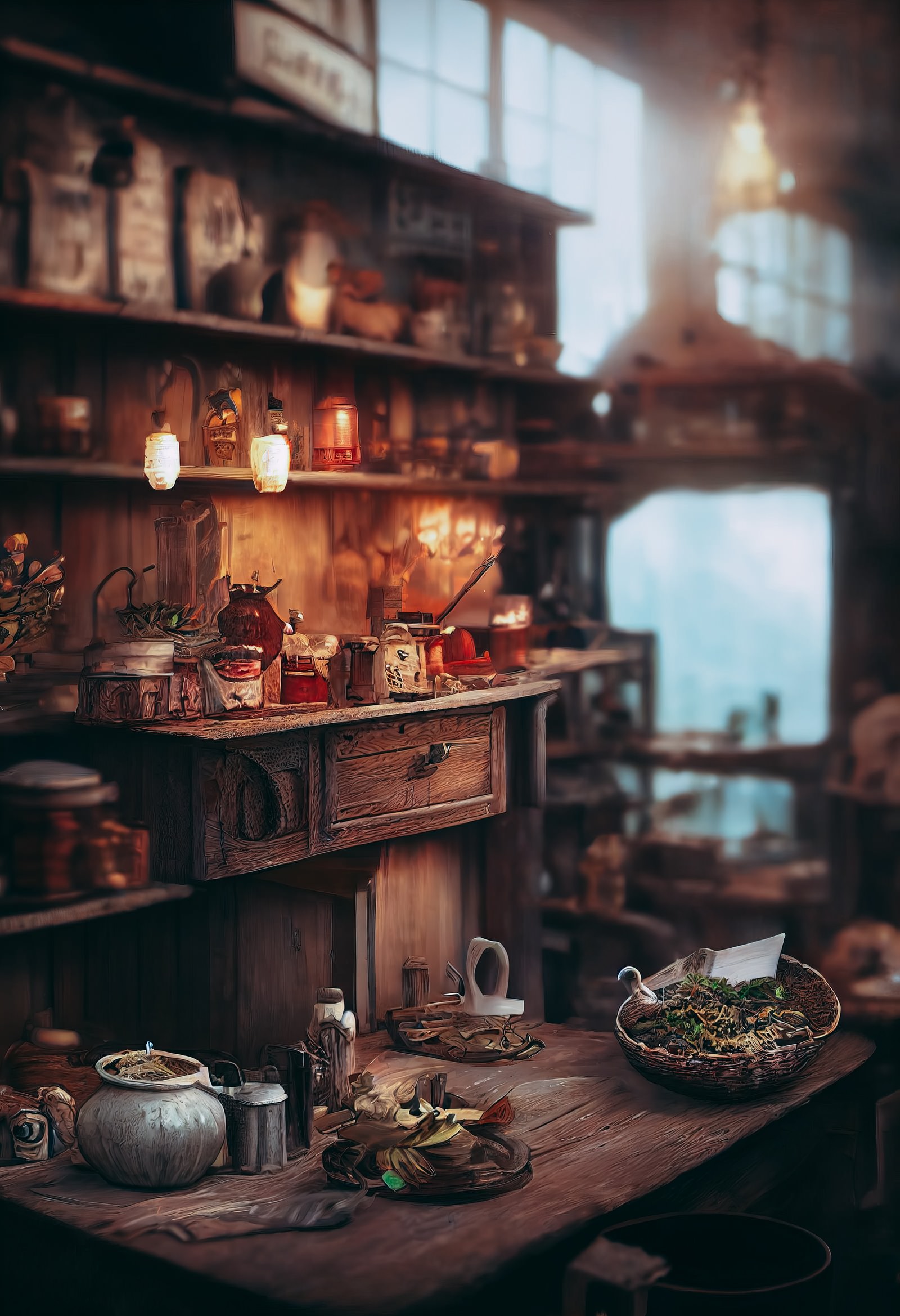 AIで生成したハーバルショップの調合台と店内の画像素材です。木製の調合台には薬草やハーブが入った瓶や調合器具が並び、レトロなランプが明るく照らしています。ゲームやファンタジー小説、ポスターデザインなどにおすすめです。