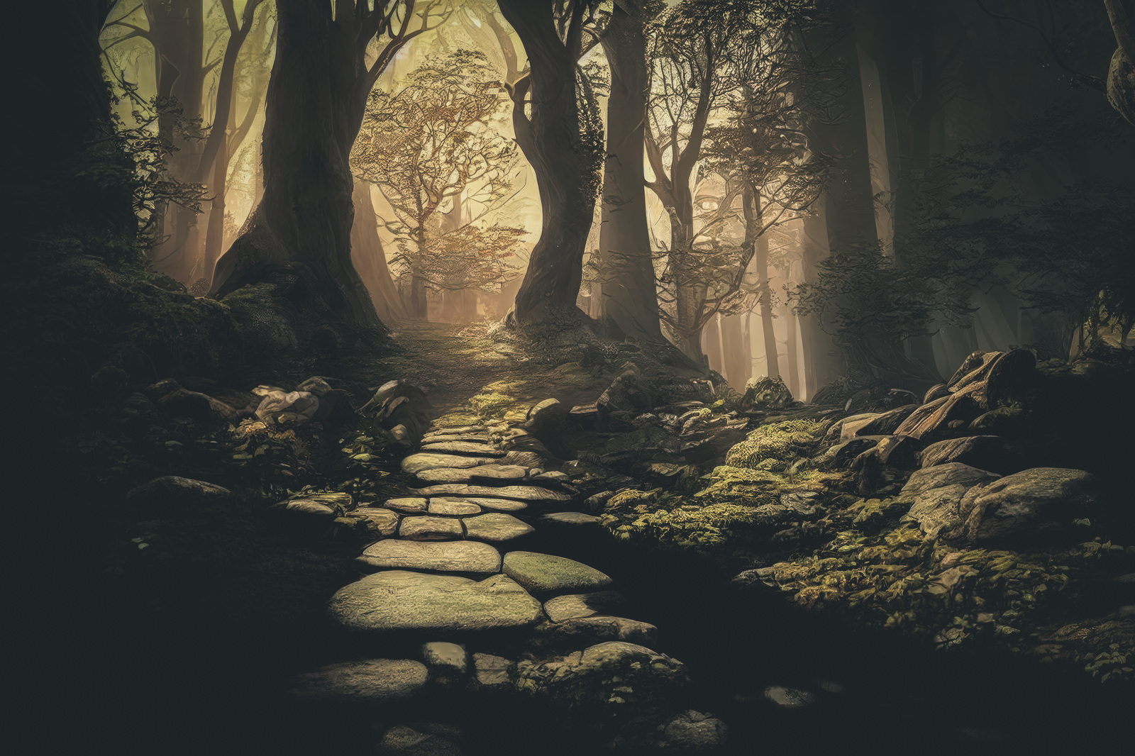 AIで生成した光差す森の登山道の画像素材です。苔むした石畳の小道が続き、木々の間から黄金色の光と靄が漏れています。ファンタジー系のゲーム背景や冒険テーマのデザイン制作に使えます。