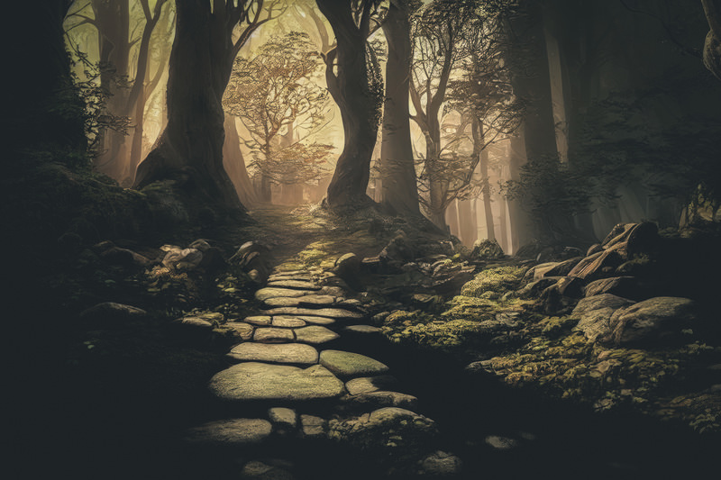 光差す妖精の森で迷い込んだ登山道と苔むした石畳のAI画像素材(フリー)