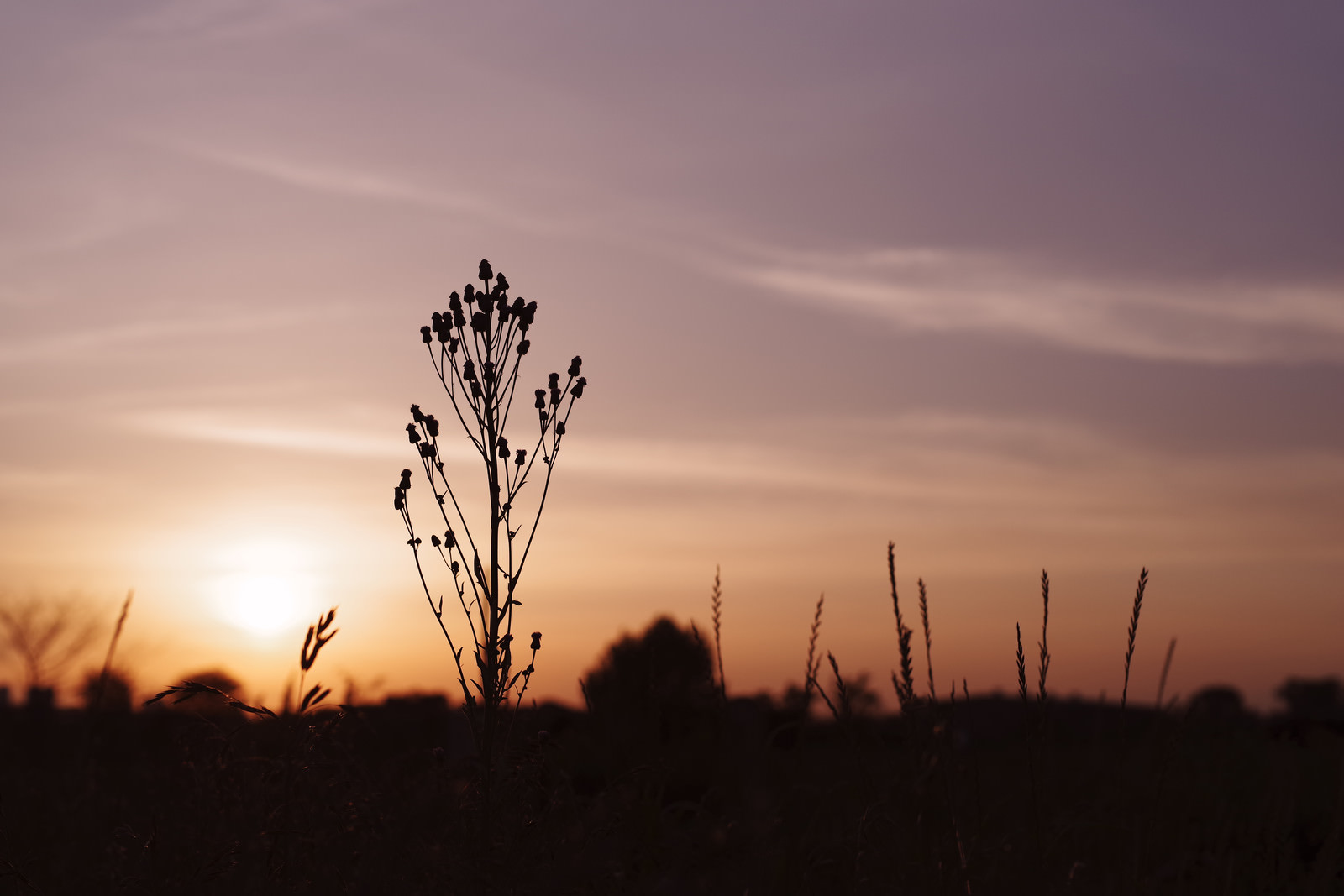 夕焼けに染まる空を背景にしたキツネアザミの枯れた茎の写真素材です。細長い茎の先端の球状の花がシルエット化し、夕日に逆光で浮かぶ様子が映っています。奥には穀物のような背の高い草も薄暗く見え、秋の季節素材として活用できます。