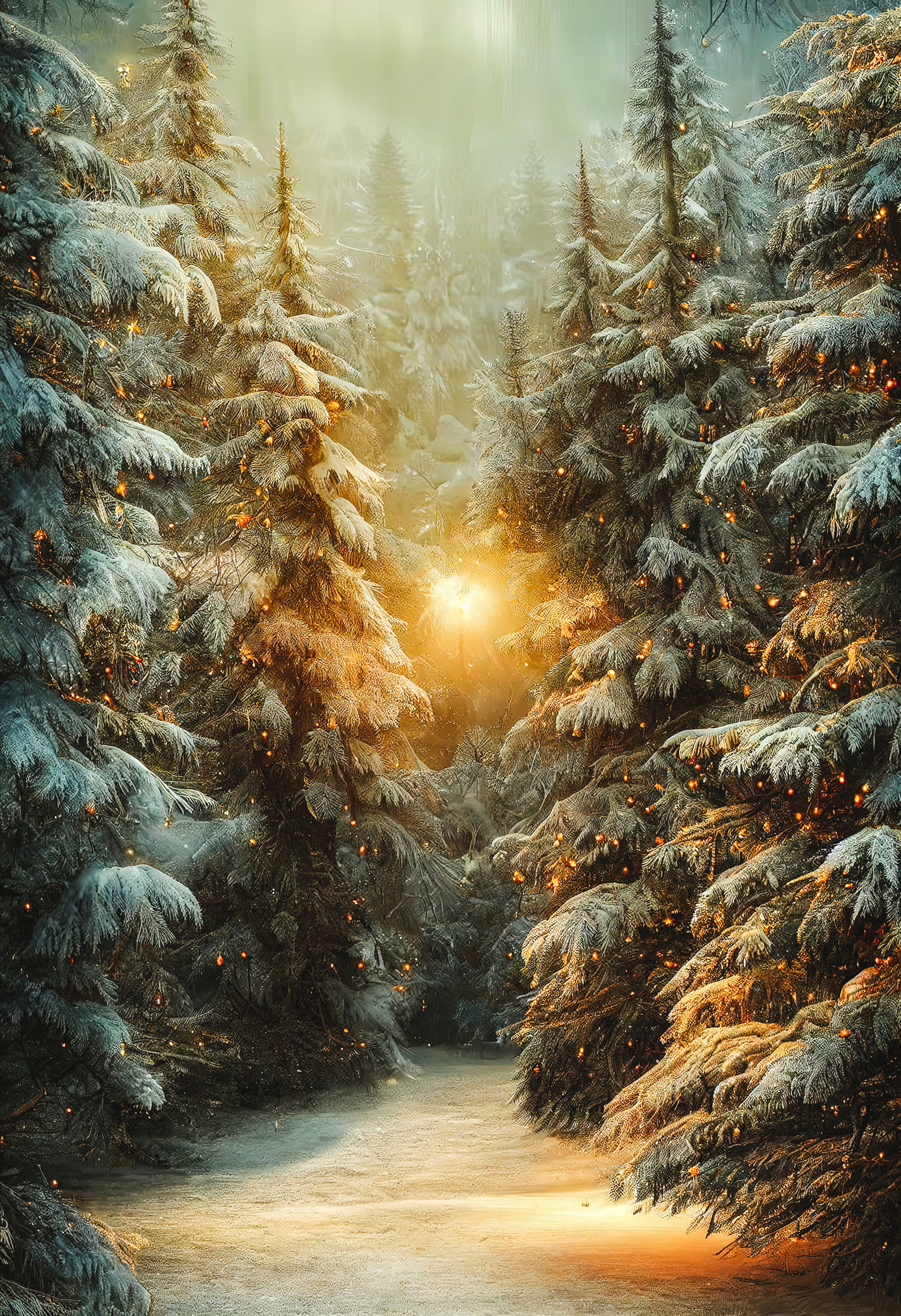 AIで生成した雪に覆われたモミノキの森を光が照らす画像素材です。積雪に白くコーティングされた針葉樹が両側に立ち並び、中央の道奥から黄金色に輝く光が差し込み、雪面にも温かみのある色合いで反映されています。冬景色やファンタジー表現、クリスマスシーズンのデザイン素材などに活用できます。
