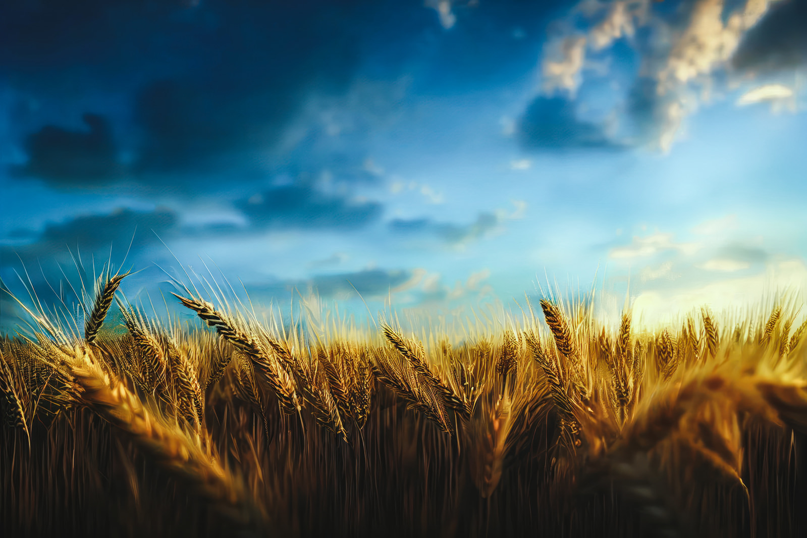 朝焼けの空と黄金色の小麦畑