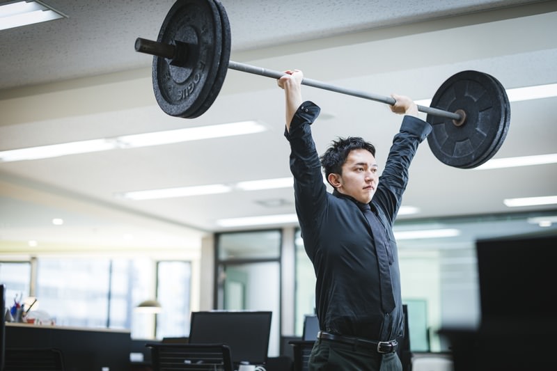 オフィスの室内でバーベルを持ち上げている男性の写真素材です。黒いジャケットを着た男性が両手でバーベルを肩の高さまで持ち上げており、天井のライトが照らす明るい事務室の中で筋トレを行っています。経営者やビジネスパーソンの健康管理、ウェルネス関連コンテンツ、企業のブランドイメージなどにおすすめです。