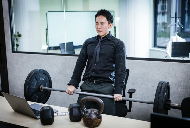 オンライン会議中にバーベルでトレーニングする男性経営者の写真素材です。黒いシャツとネクタイ姿で机横でウエイトリフティングし、奥に会議用モニターが見えています。経営者やビジネスパーソン向けのブログ記事、健康管理やセルフマネジメント関連のコンテンツ制作におすすめです。