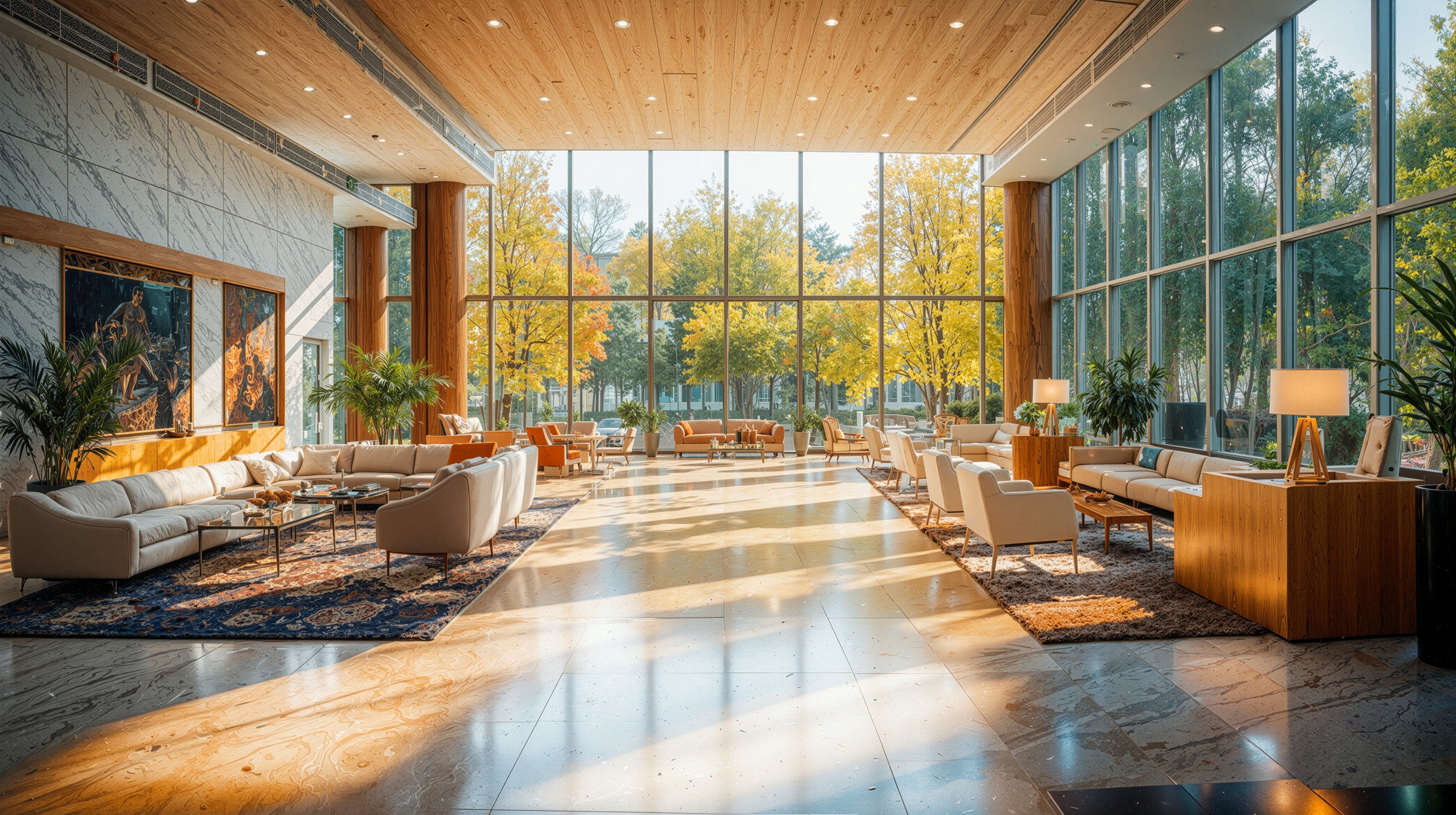 AIで生成したホテルラウンジの画像素材です。大きなガラス窓の外には紅葉した木々が広がり、床に光が差し込んでいます。ホテル紹介サイトや旅行関連の記事などにおすすめです。