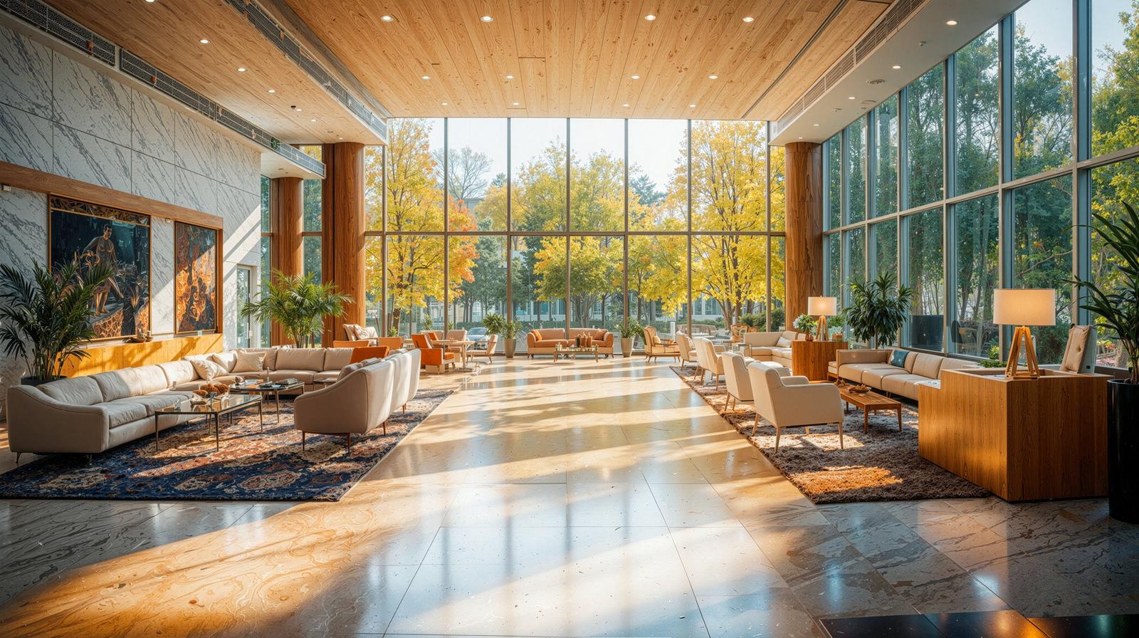 紅葉が見える大きなガラス窓とソファが並ぶホテルロビーのラウンジ
