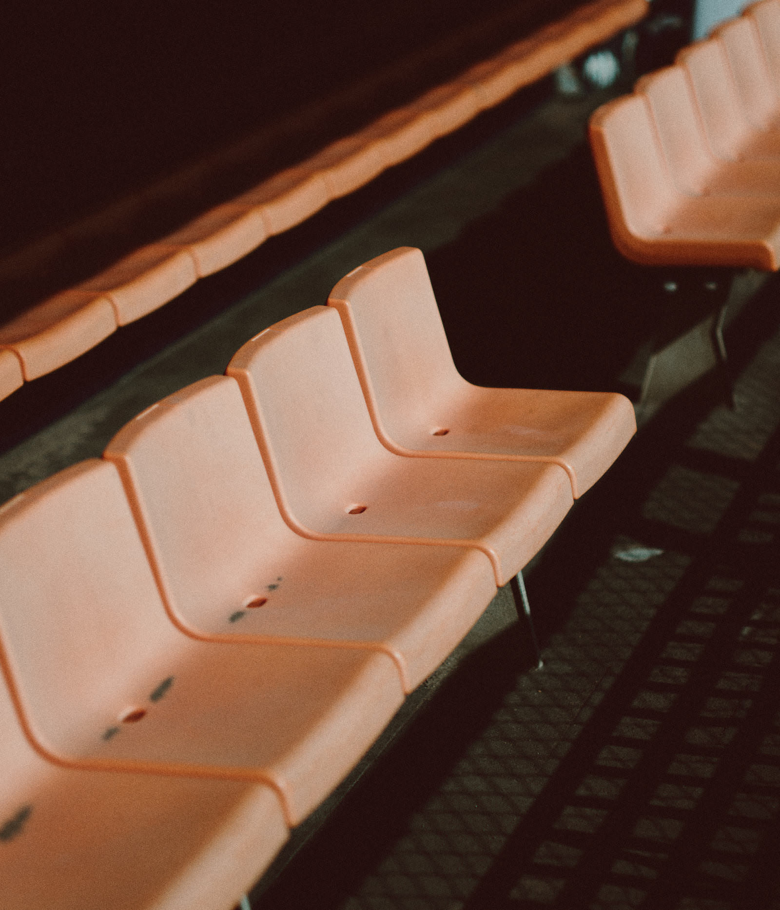 みちのく鹿島球場のベンチサイドの座席の写真素材です。オレンジ色のプラスチック製座席が斜め方向に複数並んでおり、ドレインホール付きで背もたれは立てられた状態です。野球場やスタジアムの紹介、スポーツ施設の紹介ページやブログ、地域観光コンテンツなどにおすすめです。