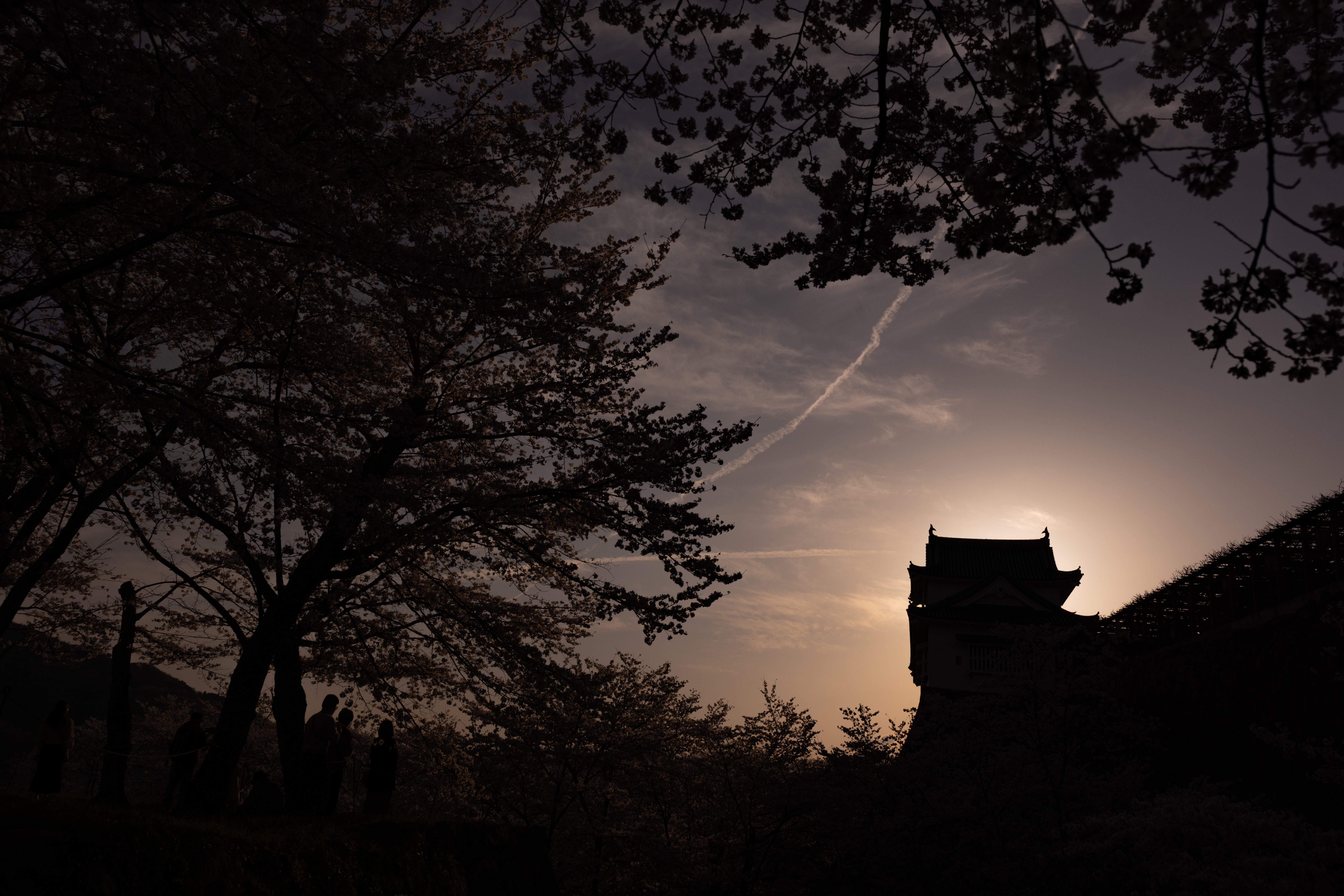 Silhouettes of Bichū Yagura and Cherry Blossoms at Tsuyama Castle Ruins at Dusk