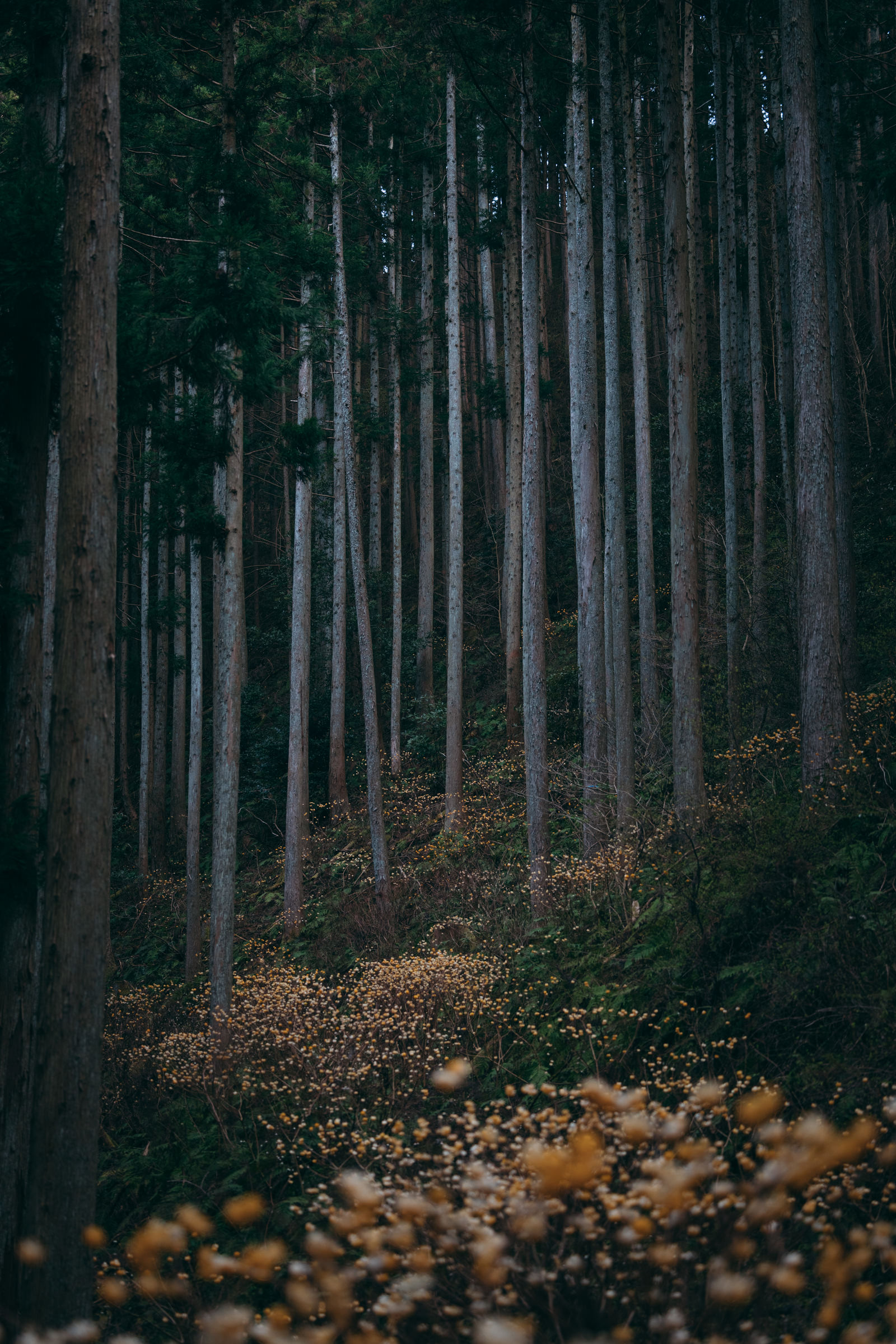 雑木林に自生する三椏の群生地の写真素材です。春先に黄色い花を咲かせる三椏は沈丁花科の樹木で、樹皮が白く剥がれた落葉樹が立ち並び、古くから和紙の原料として利用されてきました。春の自然風景や植物図鑑、森林環境に関するコンテンツなどにおすすめです。