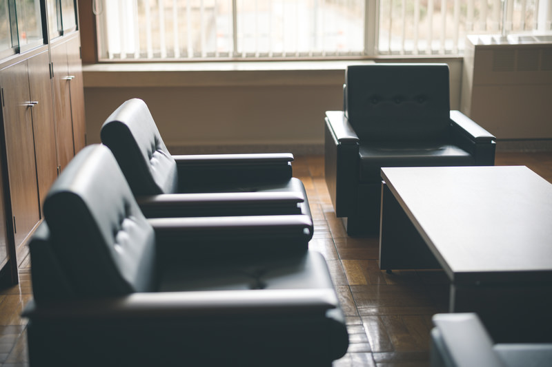 福島県大熊町のOIC施設内にある元校長室の椅子の写真素材です。黒いクッション材の背もたれと座面を持つ事務用椅子が窓際に配置され、コンクリート製の机の上には白い書類トレーが置かれています。学校関連のコンテンツ制作や、地域の歴史・施設紹介、教育現場のデザイン素材などにおすすめです。