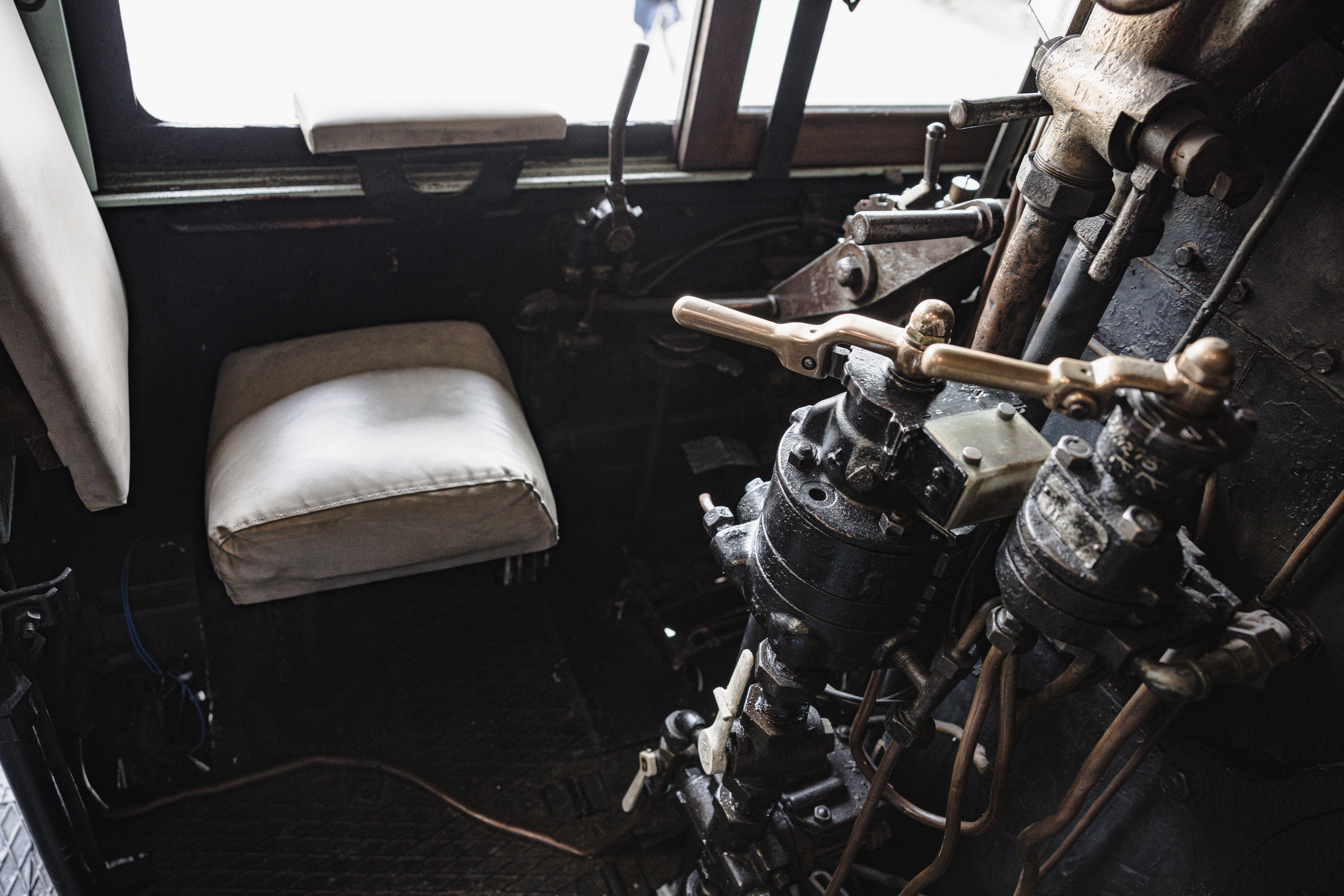 蒸気機関車の機関室内の運転席の写真素材です。白いクッション座席の左奥に黒い配管やレバー、真ちゅう製ハンドル、メーター類が密集して配置されており、運転に必要な各種操作機器が備え付けられています。鉄道史やSL関連の記事、鉄道遺産の紹介、レトログッズやノスタルジックなコンテンツ制作などにおすすめです。
