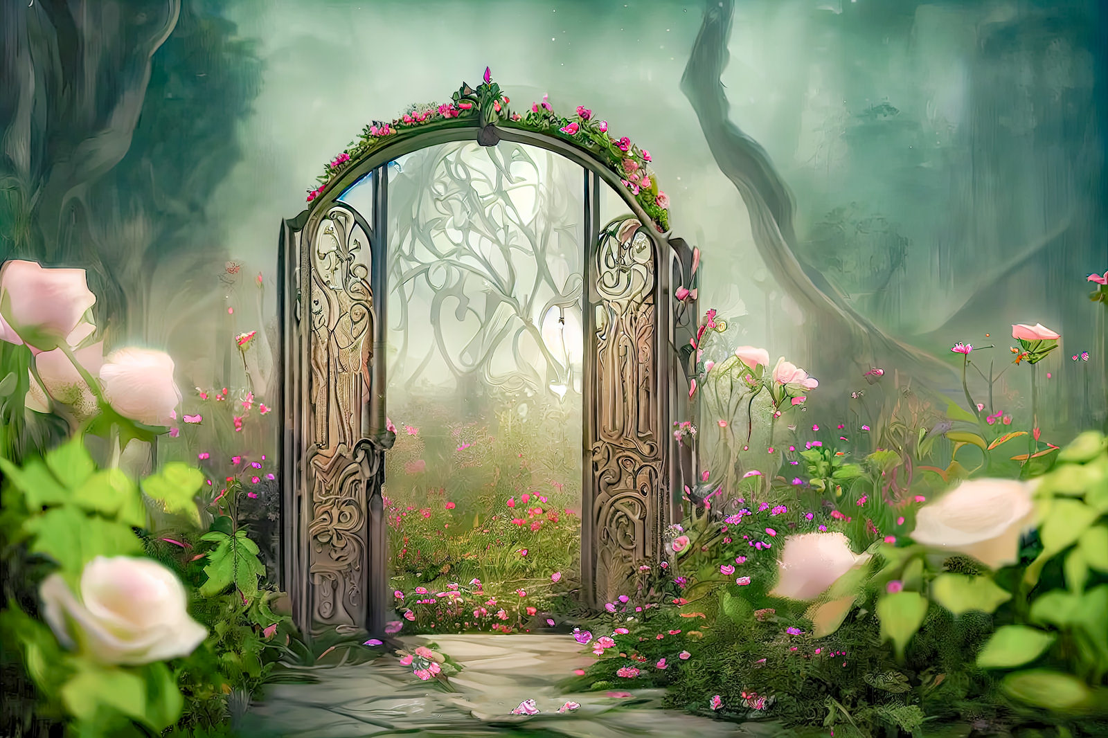 花々で彩られた装飾的な門のある幻想的な庭園風の景色