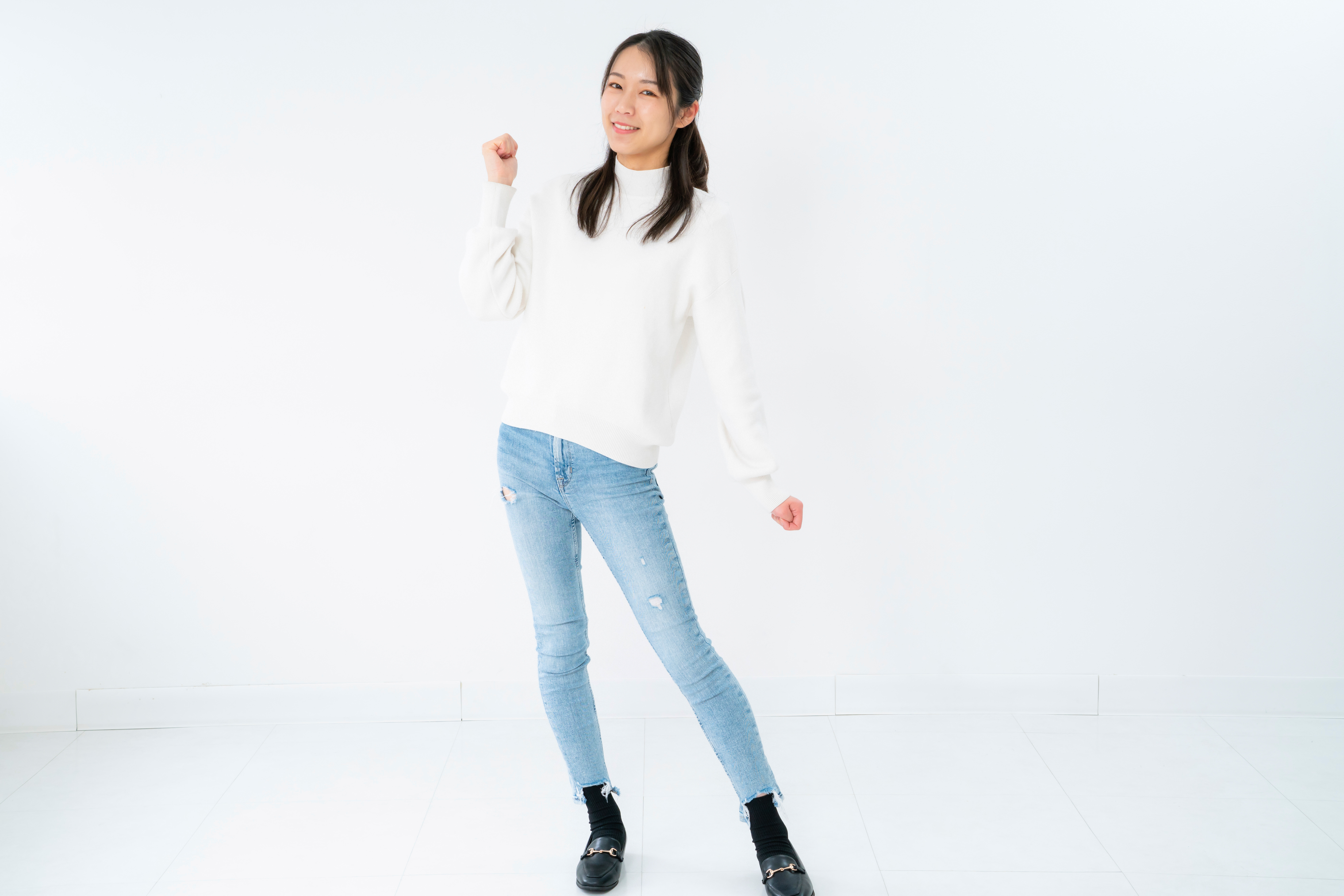 拳に力を込めてガッツポーズを決める女性の写真素材です。白いトップスとライトブルーのデニムパンツを着た女性が、両腕を上げて右拳を握り、爽やかな表情で笑みを浮かべています。やる気や前向きなイメージの表現、自己啓発関連のコンテンツ、SNS投稿やWebサイトなどにおすすめです。