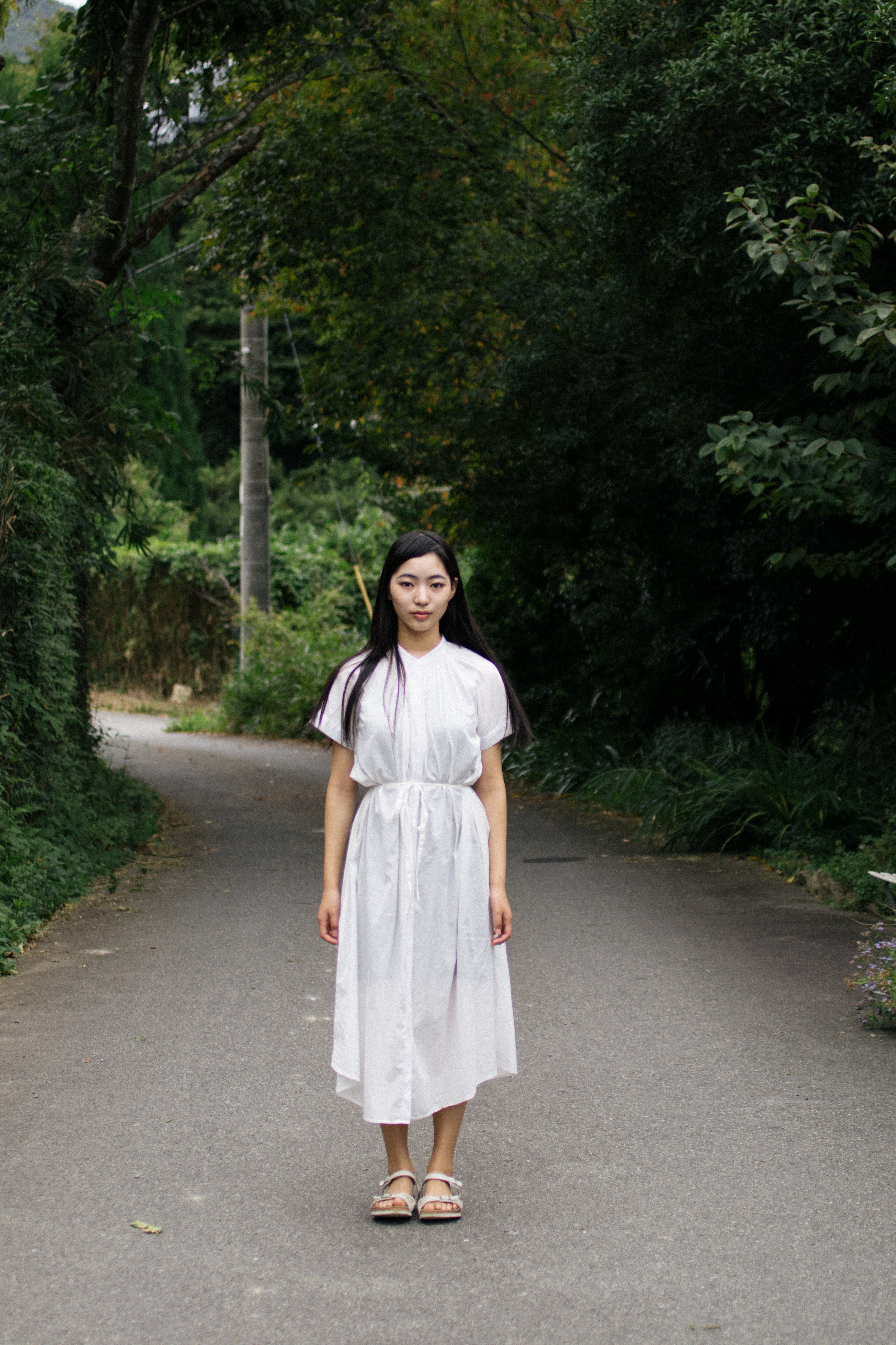 緑に囲まれた道に棒立ちする女性の写真素材です。白いワンピースとサンダルを身に付けた女性が、両側に茂った木々に囲まれた舗装路の中央で真っすぐ立ち、カメラを向いています。ファッション撮影やポートレート、広告・雑誌のビジュアル素材として活用できます。