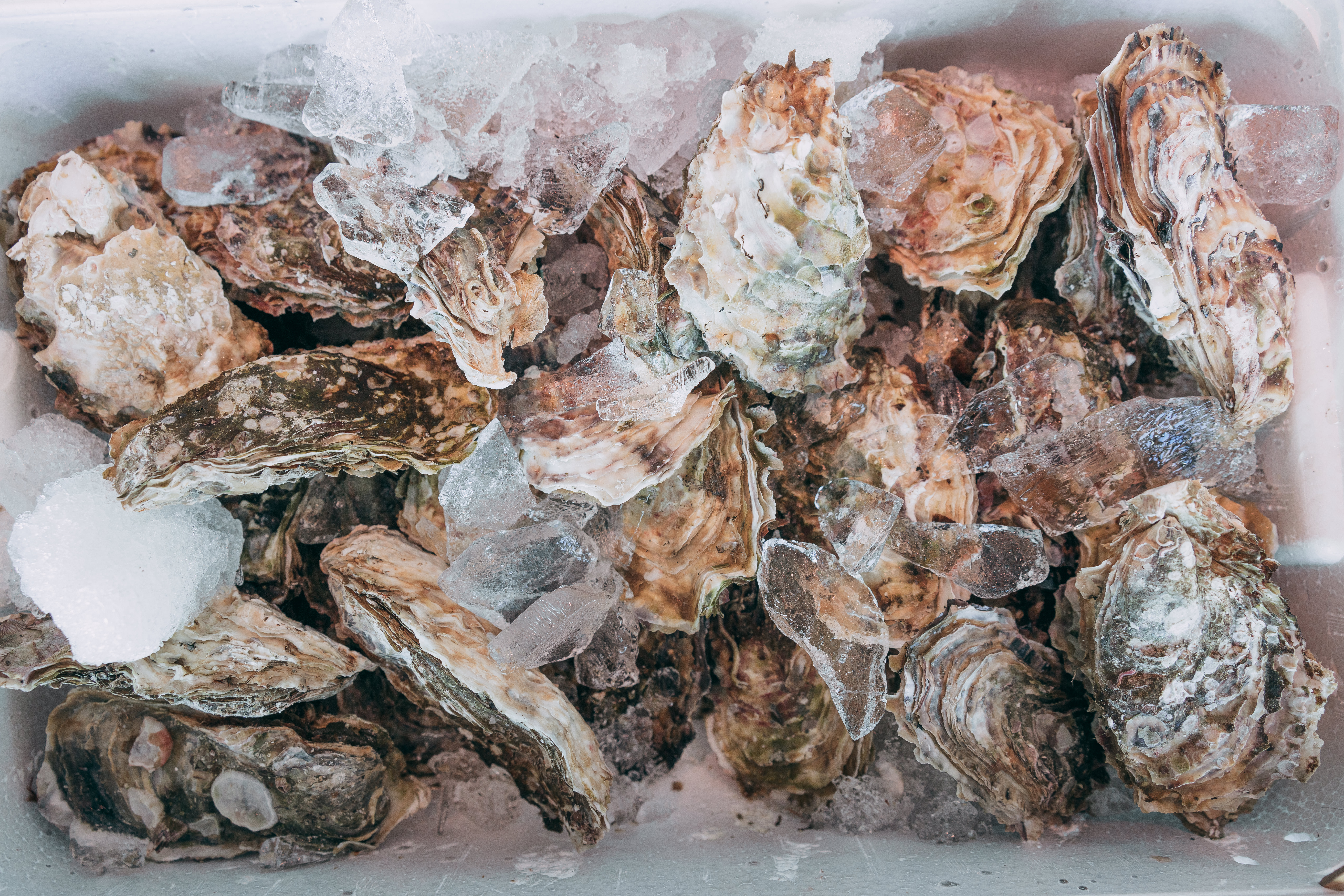 小名浜港で水揚げされた殻付きの岩牡蠣の写真素材です。氷に覆われた白いクーラーボックスに、茶色と白い殻の牡蠣が詰められた状態で積み重なっており、漁港での新鮮な海産物の流通風景を捉えています。海産物の販売、漁港の風景、地域産業の紹介、グルメ関連のWebサイトやブログなどにおすすめです。