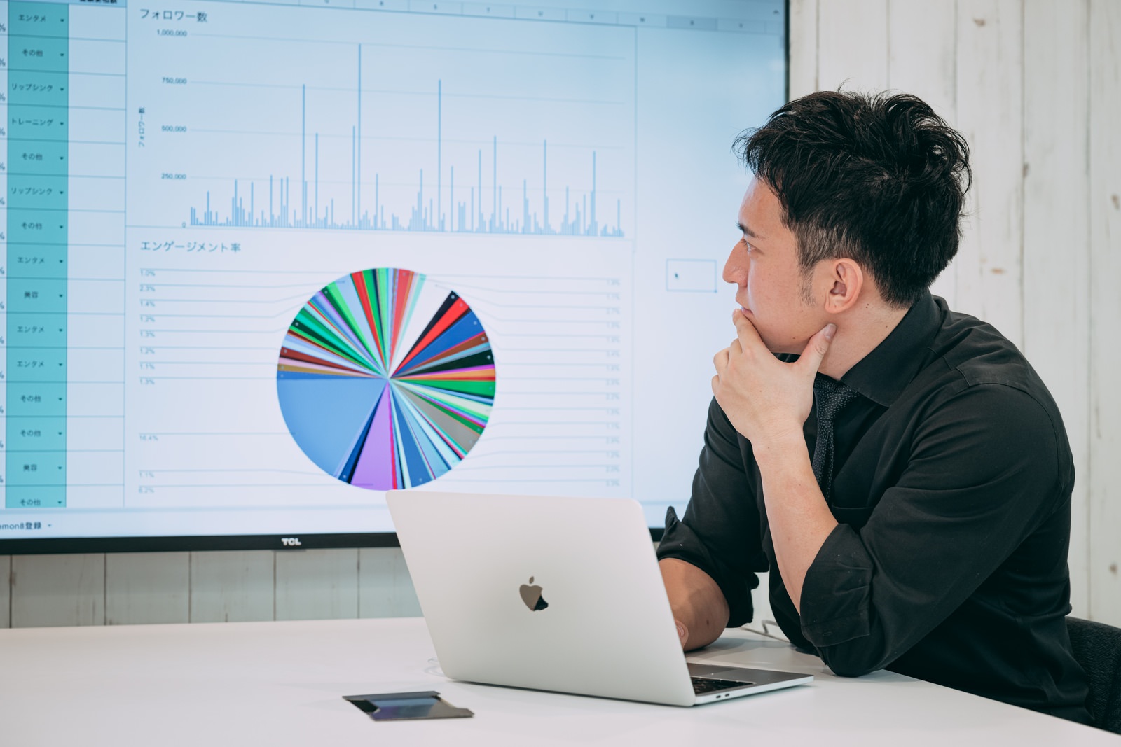 英語のページ:Male CEO checking business performance by reviewing pie charts
