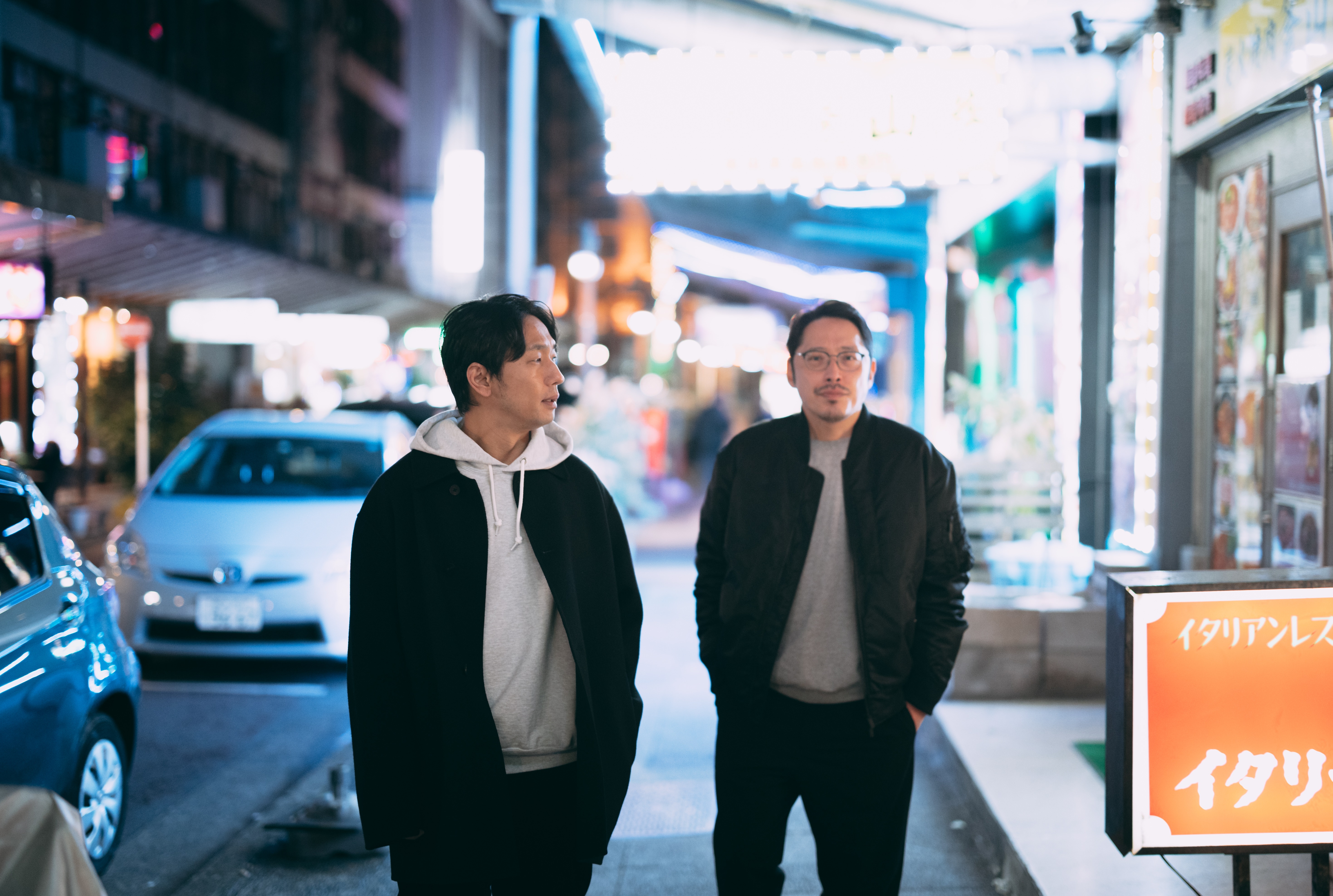 夜の繁華街で飲み屋を探す男性ふたりの写真素材です。黒いジャケットの眼鏡男性とグレーのパーカー男性が並んで歩き、ネオン照明が灯る下町の商店街を見回っています。飲食店や居酒屋の紹介、グルメ関連のWebサイト、ブログ、SNSなどにおすすめです。