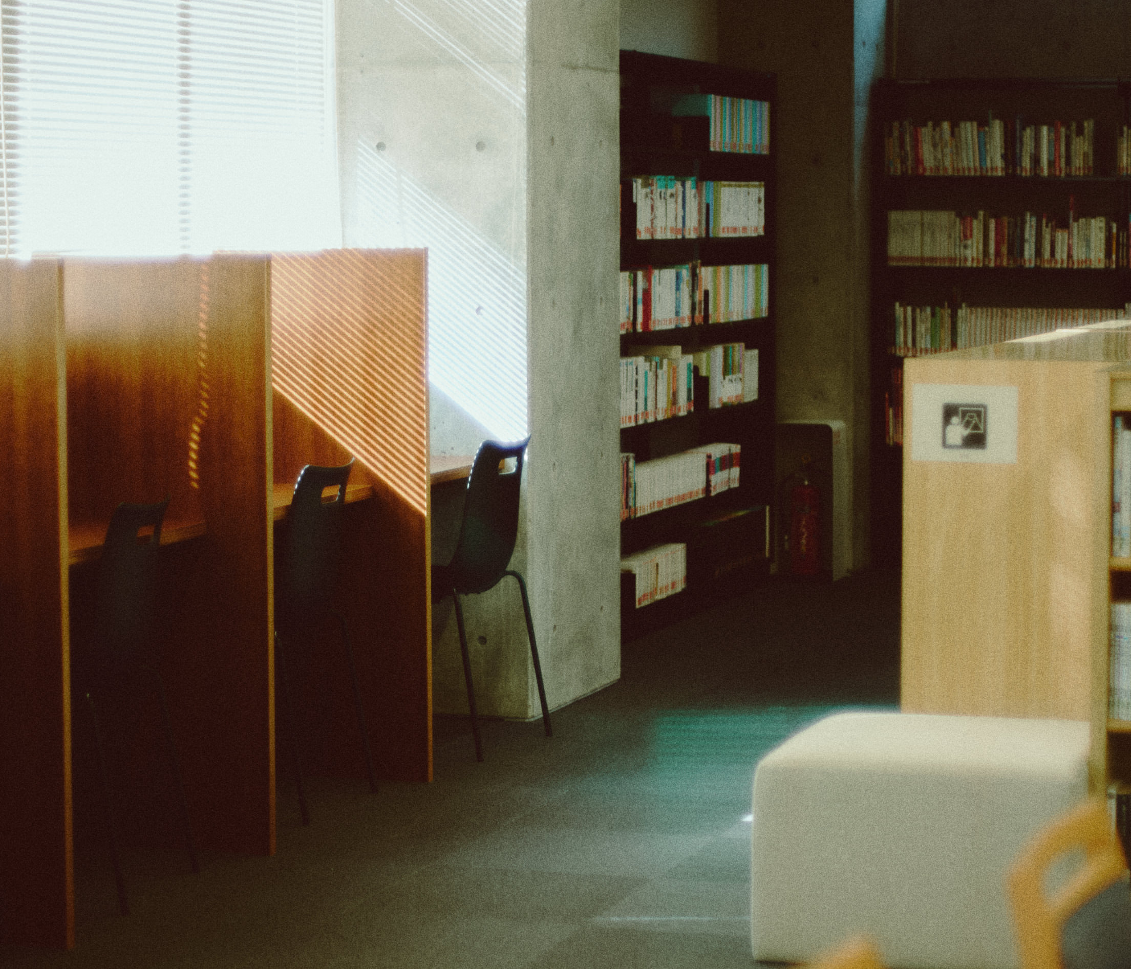 ふたば未来学園の図書室の写真素材です。木製の仕切り板が立てられた読書スペースに黒いパイプ椅子が置かれ、床から天井まで本棚が設置された学習環境となっています。学校施設の紹介や教育関連コンテンツ、学習環境の素材などにおすすめです。