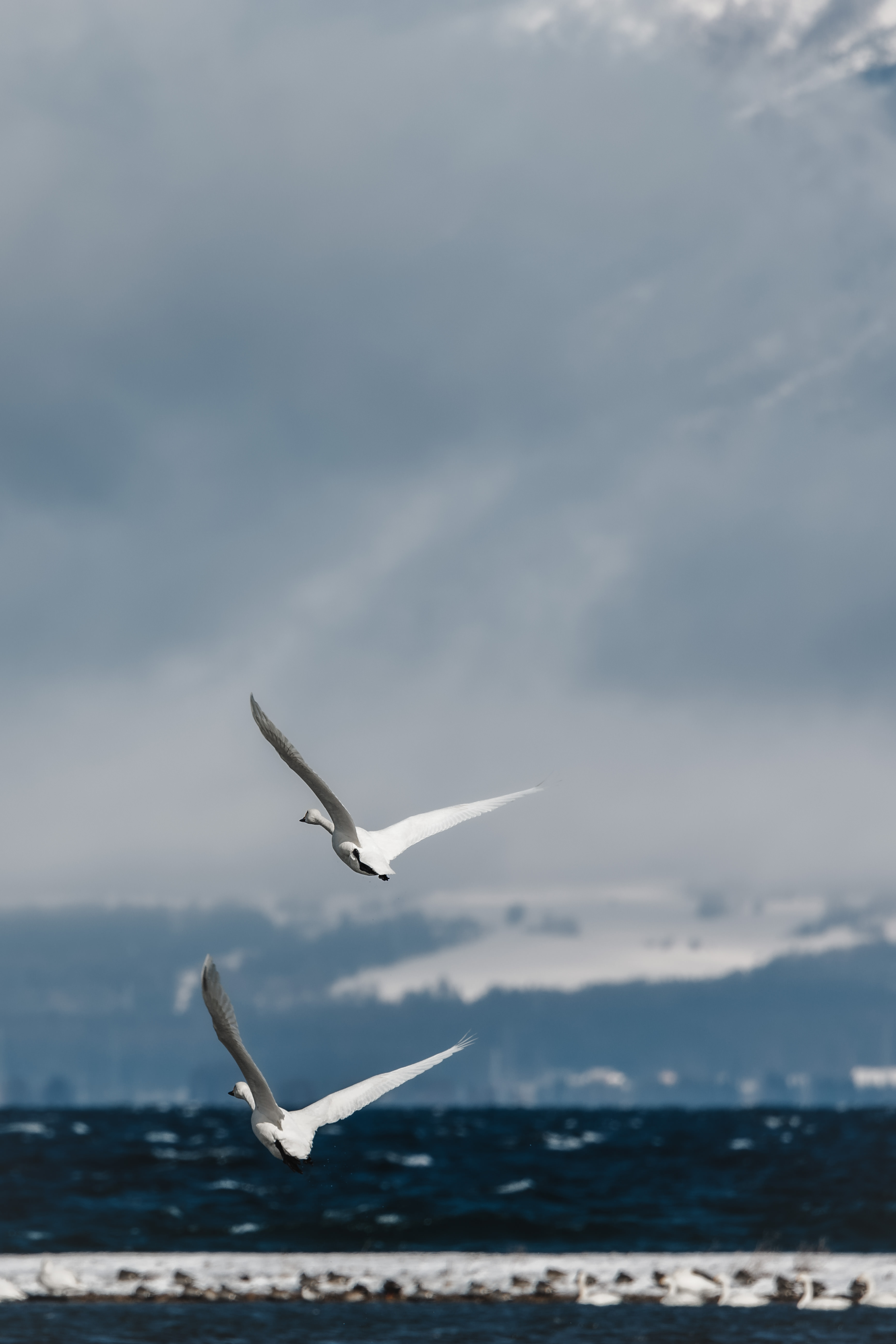 Swans Taking Flight with Outstretched Wings at Lake Inawashiro
