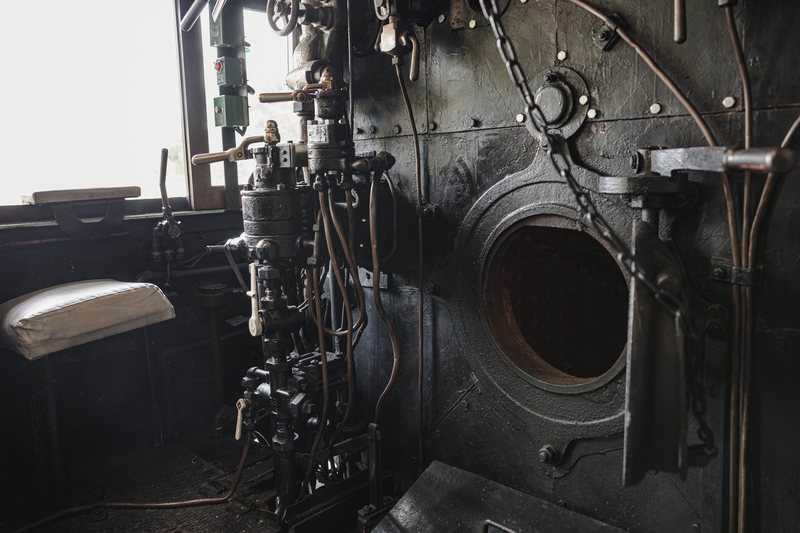 蒸気機関車の機関室内部の写真素材です。焚口戸が開いたままで、ブレーキ弁のハンドルや金属製の操作部品が配置され、火室の開口部が黒く見えています、機関士が操作していた各種レバーやハンドルの配置状況が確認できます。鉄道博物館や蒸気機関車関連のコンテンツ制作、歴史解説資料などにおすすめです。