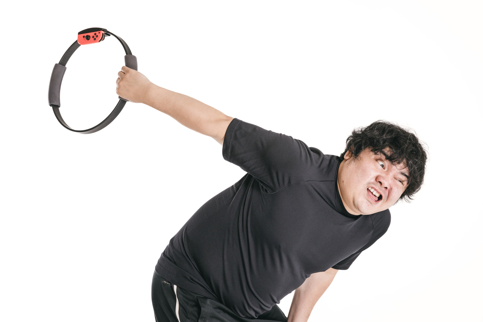 リングコンを片手で頭上に持ち上げ、体を横に傾けて力を込めている男性の写真素材です。口を開けたきつそうな表情が、運動の負荷をリアルに伝えてくれる。ゲームフィットネスや自宅トレーニングの記事・広告素材に使えます。