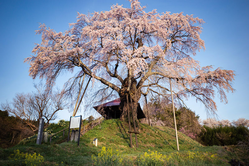 上石の不動ザクラの写真素材です。樹齢が古い一本桜が淡いピンク色の花で覆われ、幹から枝垂れた枝は地面に向かって優美に曲がり、根元には赤い屋根のお堂と石碑が建てられています。春の季節素材や郡山市の観光案内、桜の名木を紹介するコンテンツなどにおすすめです。