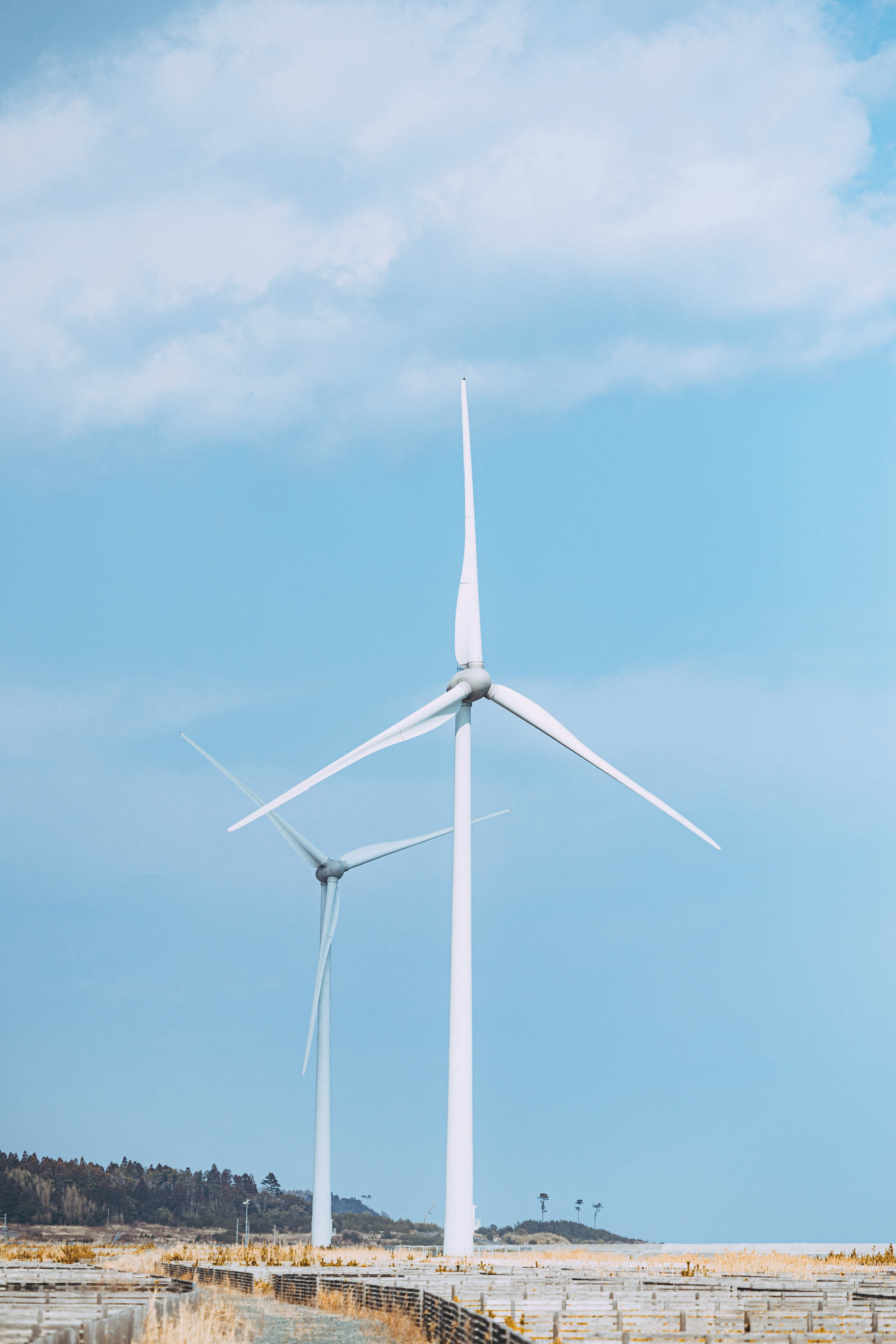 南相馬の海岸沿いに設置された風力発電システムの写真素材です。白い鉄塔に3枚のブレードが取り付いたタービンが立ち、海辺の塩性湿地に並ぶ杭と防潮堤の背後にあります。再生可能エネルギーやSDGs関連のWebサイト、企業ウェブ、環境保全を扱うブログなどにおすすめです。