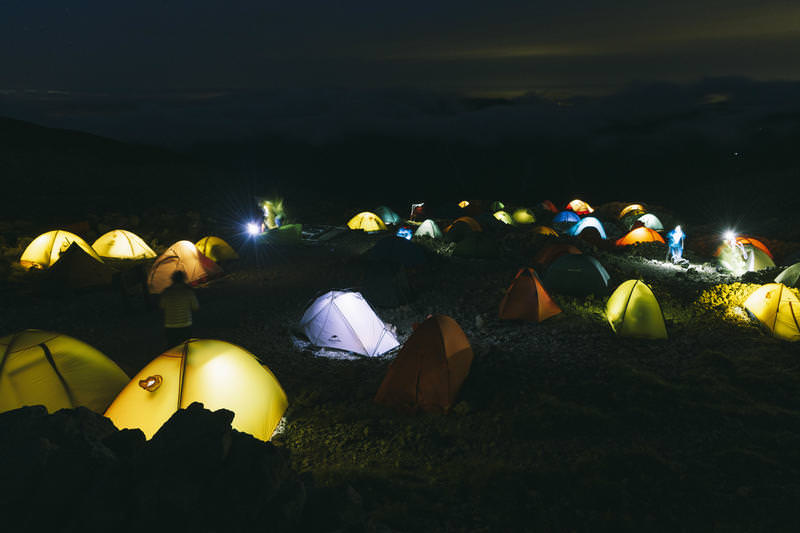 南岳のテント場で夜間に灯るテント群の写真素材です。黄色やオレンジ、白などのドームテントが内部のランプやヘッドライトで照らされ、日本百名山の槍ヶ岳周辺の暗い山肌に列をなして並んでいます。登山ブログや山岳関連の記事、アウトドア雑誌やWebサイトなどにおすすめです。