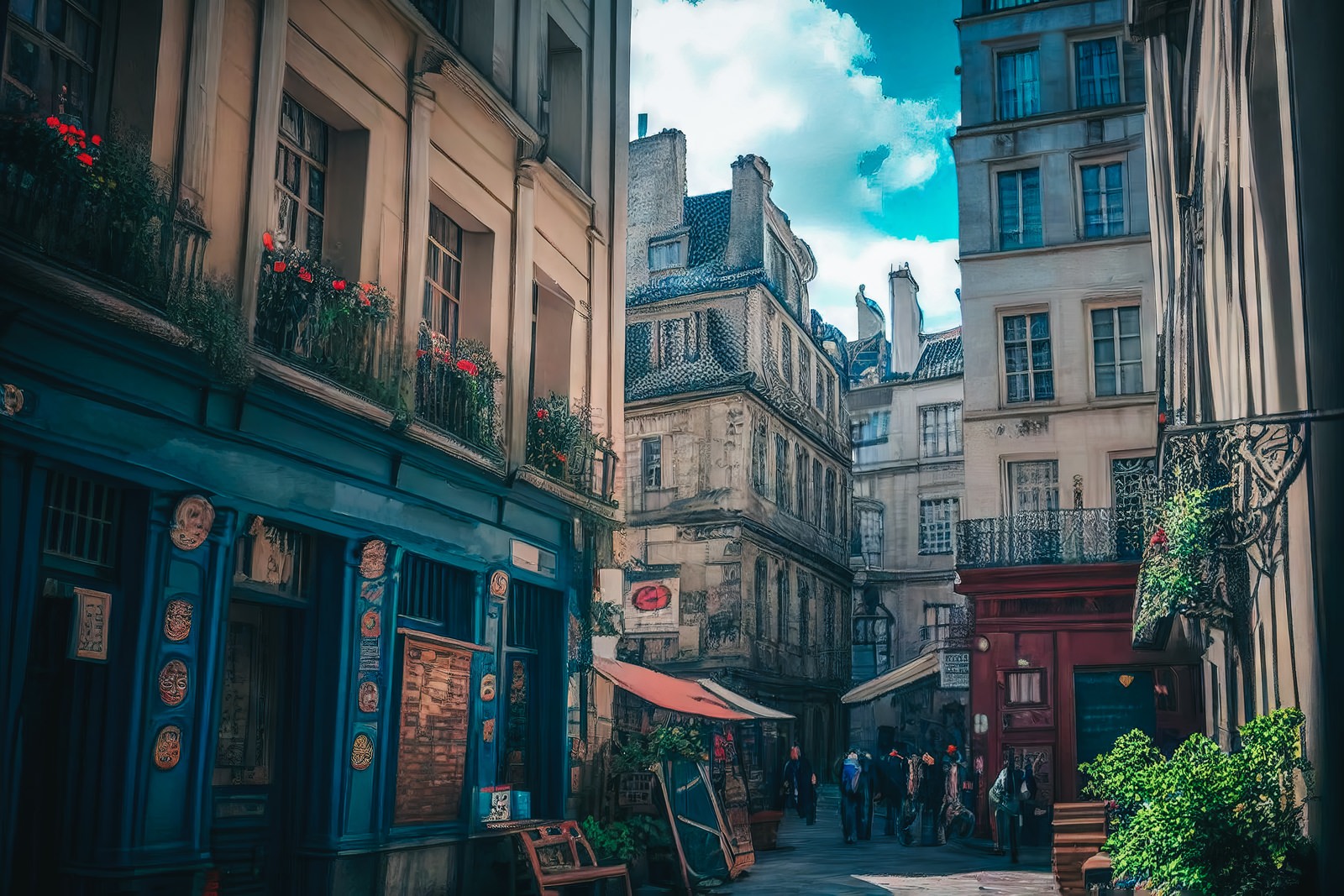 パリ風の路地裏で人々が行き交い、古い建物と店舗が並ぶ風景
