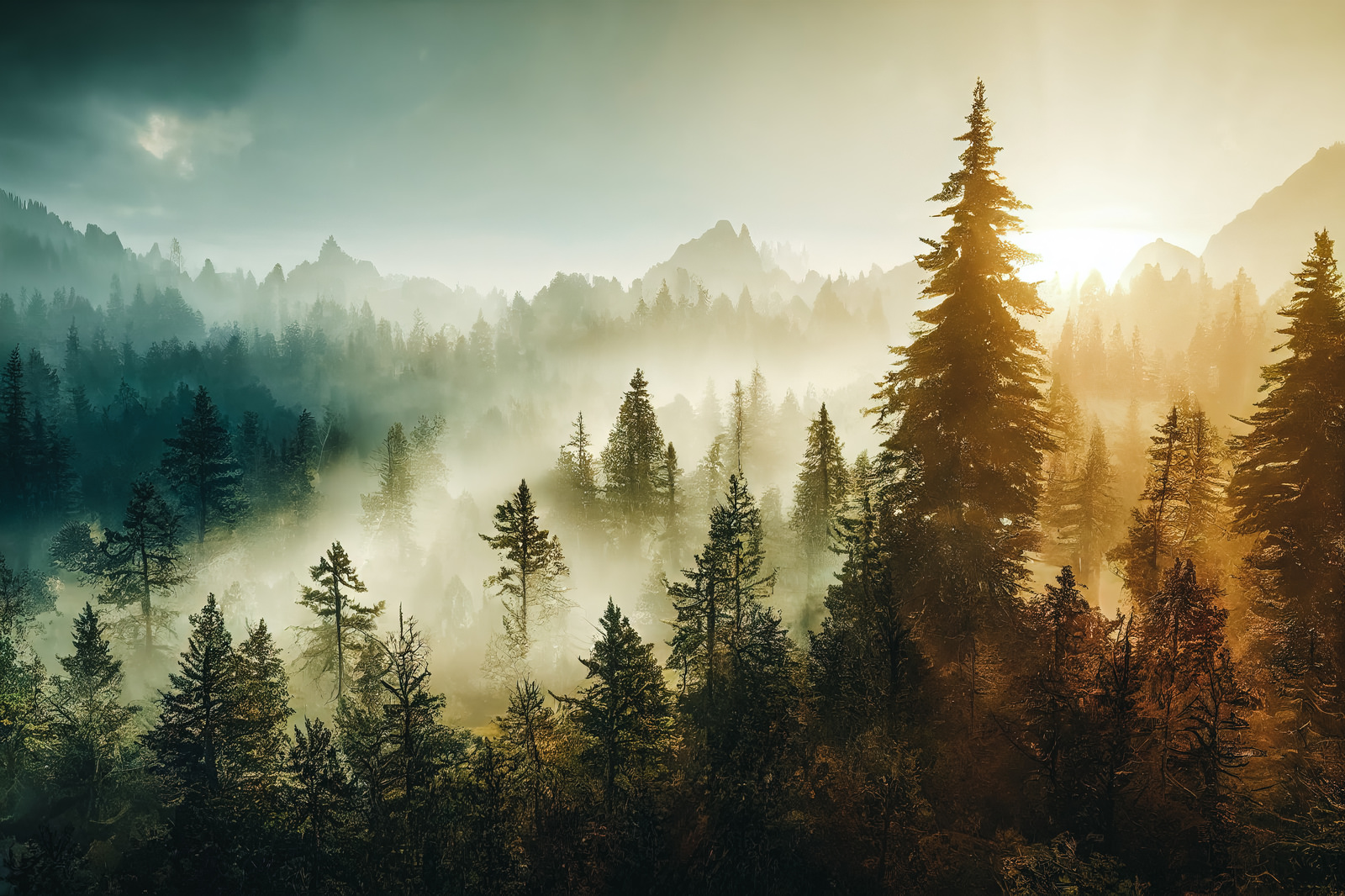 AIで生成した、針葉樹の森に霧が広がる山岳風景の画像素材です。右側から差し込む光が霧を照らし、手前の木々と奥の山並みが層を重ねている。自然風景や環境・アウトドア関連のバナーや背景素材に使えます。