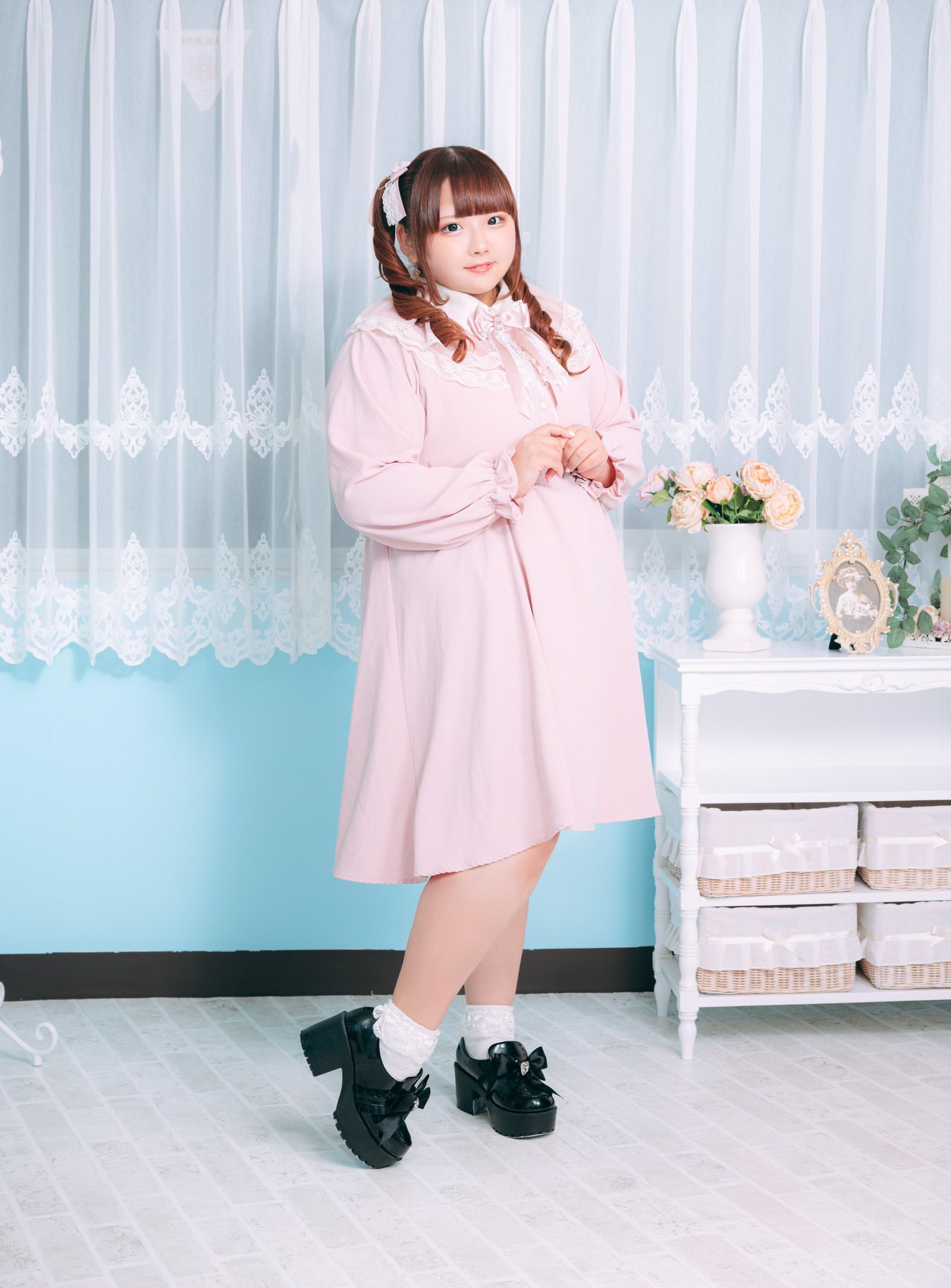 ピンク色のワンピースを着たアイドルの写真素材です。白いリボンをつけたツインテール、淡いピンク色のロングワンピースに黒いプラットフォームブーツを合わせた姿で、静かに立つポーズをしています。アイドル撮影やキャラクター系コンテンツ、推し活関連のデザイン制作などにおすすめです。