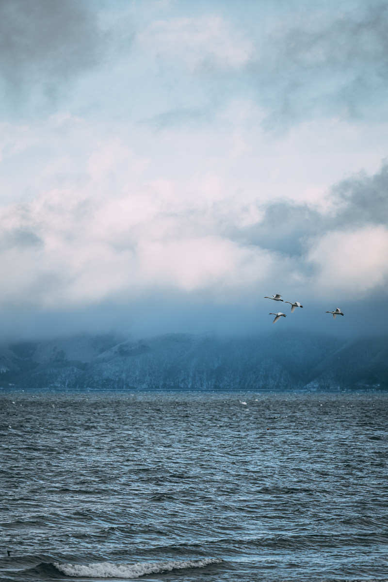 猪苗代湖から空へ飛び立つ白鳥の写真素材です。湖面から数羽の白鳥が一列になって飛び立ち、背景には雪に覆われた湖岸の樹林と厚い雲が広がっています、猪苗代湖は白鳥の越冬地として知られ、冬季に多くの渡り鳥が集まります。冬の季節素材や自然風景、野生動物関連のコンテンツなどにおすすめです。