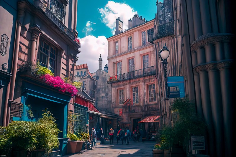 AIで生成した洋風建築が並ぶ路地裏の画像素材です。ピンク色の外壁に囲まれた石畳の通路に街灯や花の鉢植えが並び、奥には石造りの塔が見える。旅行ブログやホテルのウェブサイト、観光地の紹介素材におすすめです。