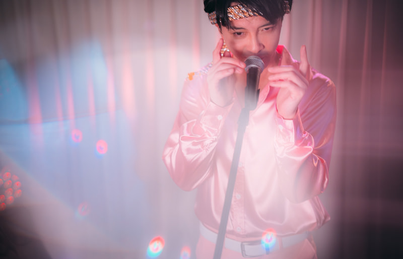 地下アイドルのステージパフォーマンスの写真素材です。ピンク色のジャケットを身に纏った男性が、スポットライトを浴びながらマイクを握り、両手を広げて熱く歌い上げています。ライブプロモーション、音楽イベント、芸能関連のWebサイト制作やSNS投稿などにおすすめです。