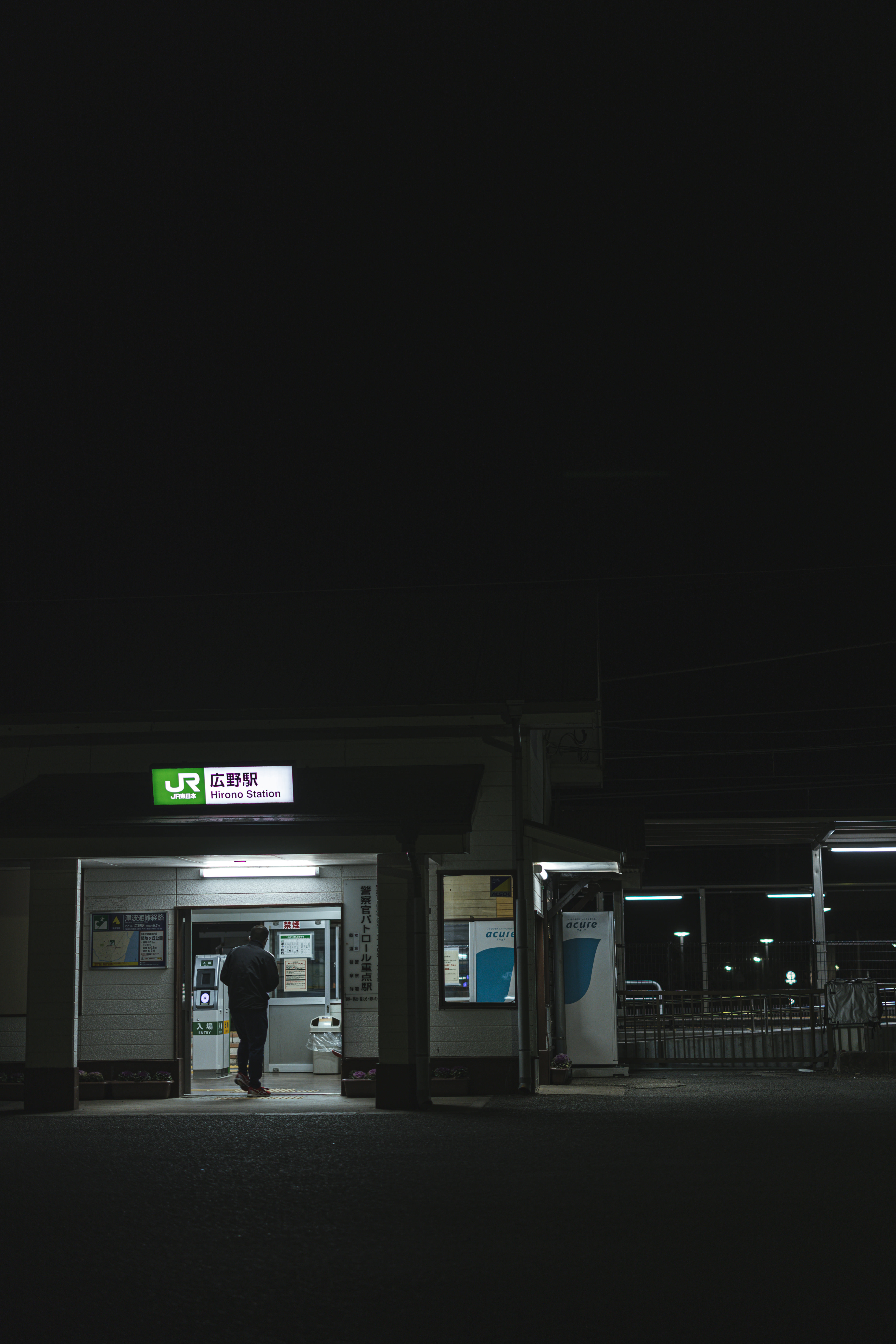 終電間際の広野町駅前の写真素材です。夜間の駅舎内では緑色のJR広野駅の看板が点灯し、乗客が切符売機の前に立っています。福島県浜通り地域の地方交通インフラを紹介するコンテンツや、旅行ブログなどに活用できます。