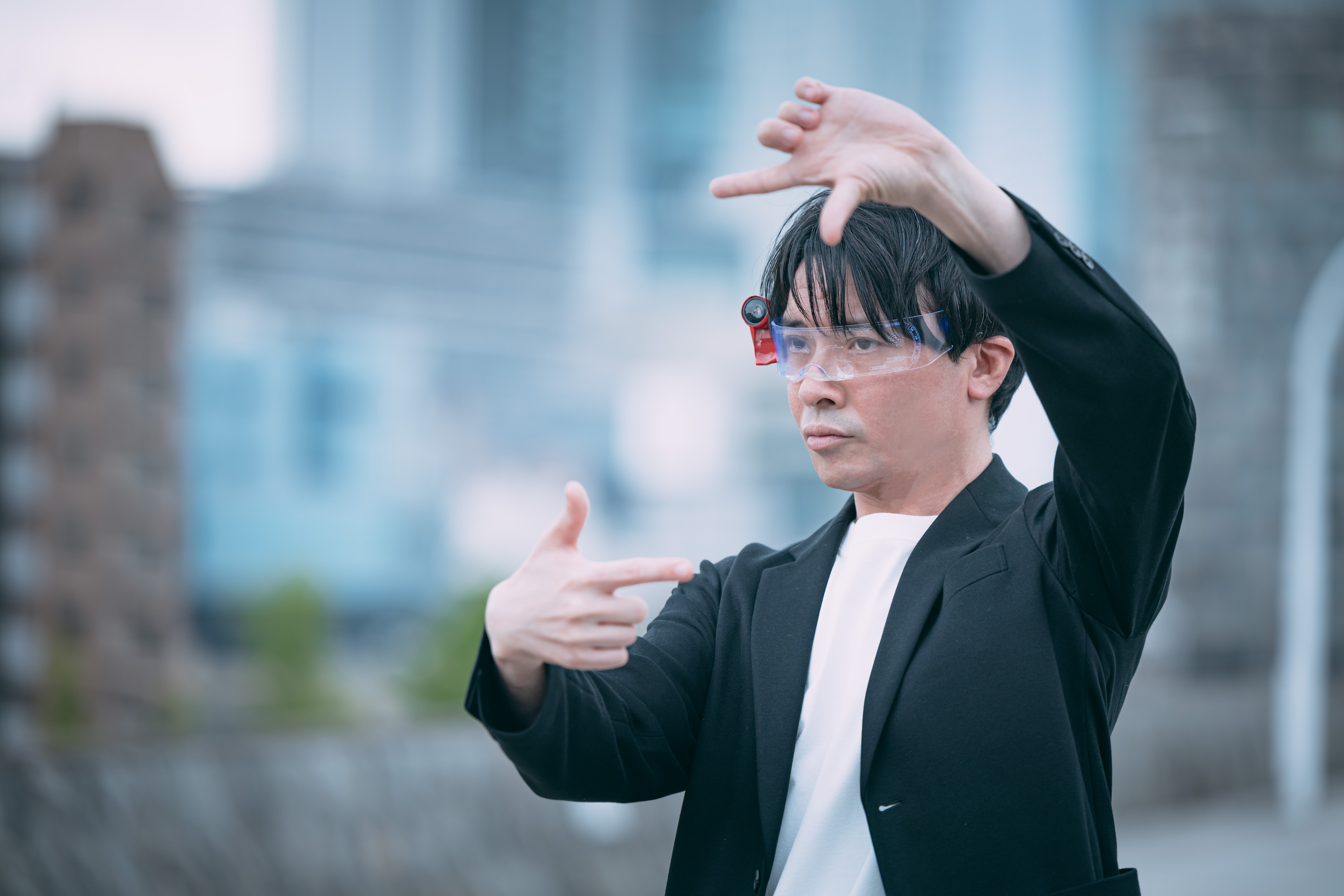 ARグラスを装着してビジョンを描く男性CEOの写真素材です。黒いスーツに白いシャツを着た男性が青いフレームのARグラスをかけ、両手を上げるジェスチャーで未来を指し示しています。企業の経営者やイノベーション関連のビジネスコンテンツ、リーダーシップ研修などにおすすめです。
