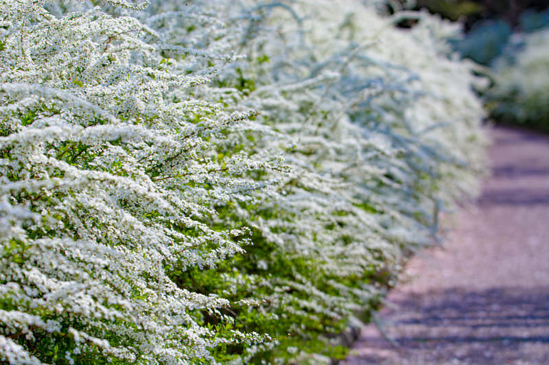 満開のユキヤナギが両側に咲き並ぶ小道の写真素材です。バラ科に属するユキヤナギは細い枝に白い小花が密集して咲き、緑の葉が見え隠れする様子が両側から覆い被さるように続いています。春の庭園や花木の紹介、季節素材や園芸関連のコンテンツなどにおすすめです。