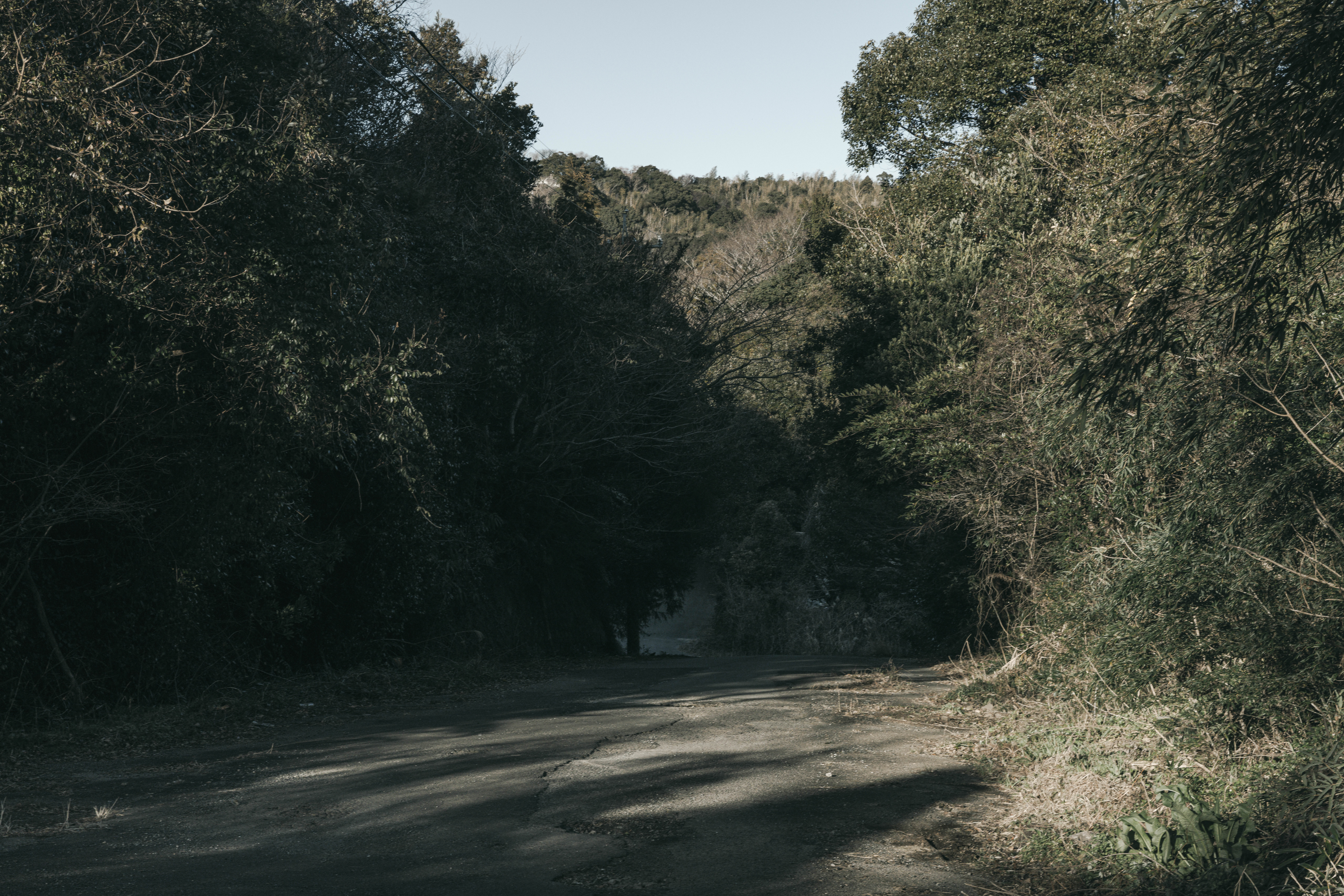 雑木林に囲まれた道路の写真素材です。左右両側に雑木や樹木が密生し、奥へ続く林道の両脇は緑と茶色の枝葉で埋め尽くされ、遠方の空が薄く見える自然風景です。道路関連のコンテンツ制作などにおすすめです。