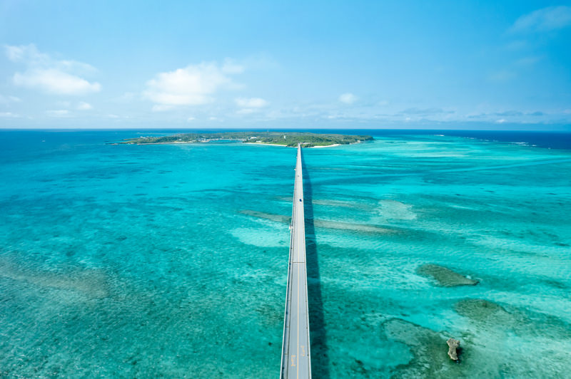 池間大橋から望む宮古島の絶景の写真素材です。白いコンクリート橋が透明度の高いターコイズブルーの海を真っすぐ伸び、橋の先には緑生い茂る島が見えています。南国の夏を代表する絶景で、旅行ブログやリゾート系Webサイト、沖縄観光や夏休みのコンテンツ制作などにおすすめです。