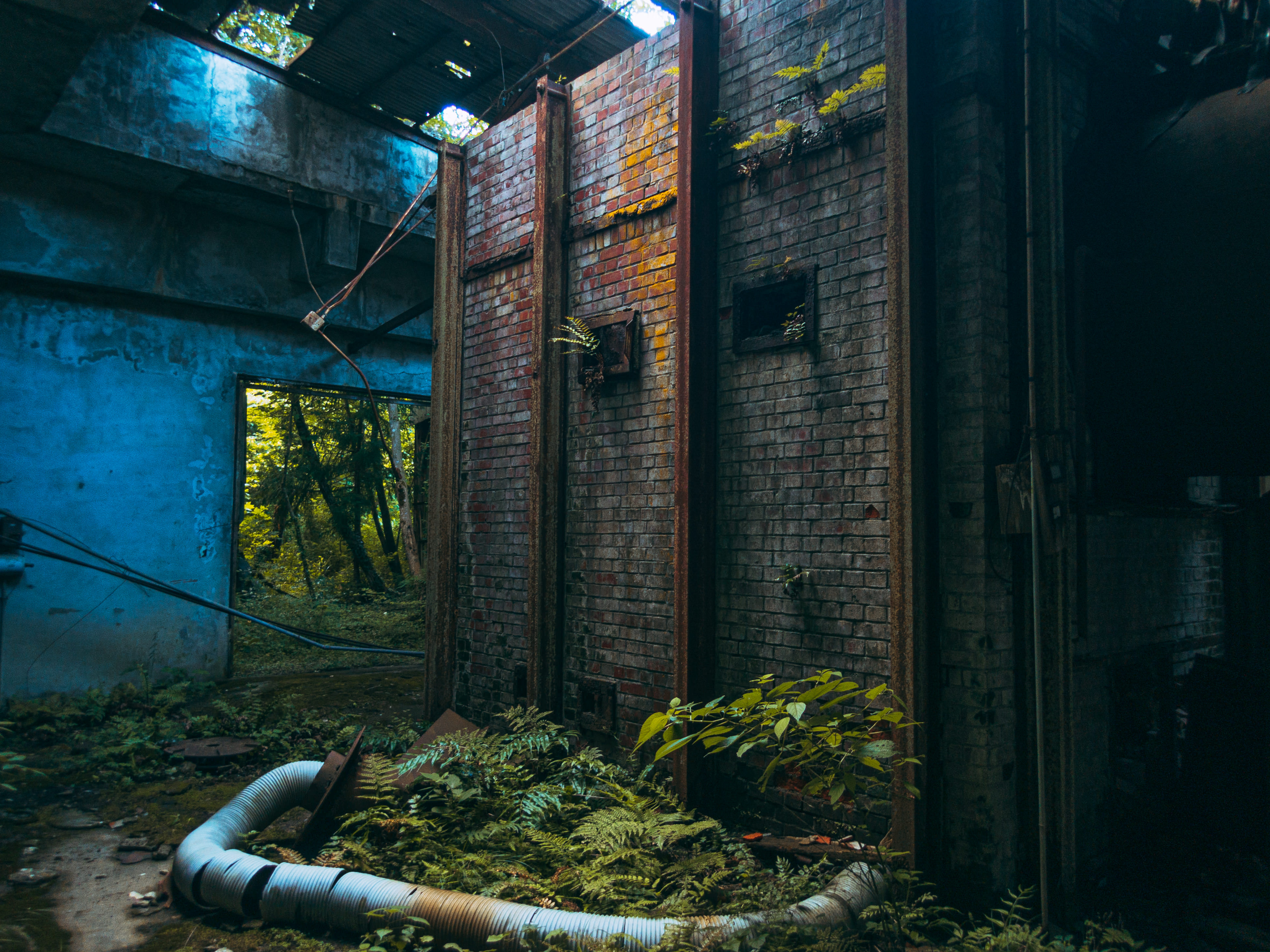 廃工場内部のレンガ壁の写真素材です。赤褐色のレンガ造りの壁には黄緑色の苔や蔦が繁殖し、鉄製の配管が床に横たわり、天井からは光が差し込みます。廃墟や歴史的建造物、ビジュアル系コンテンツなどにおすすめです。