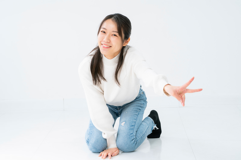 白背景で膝立ちしながらピースサインを送る女性の写真素材です。白いリブニットと薄い色のデニムを着た女性が床に膝をついて立ち、右手を顔の近くでピースサインの形を作り微笑んでいます。プロフィール画像やWebサイト、SNS、ポーズ集などの人物素材として活用できます。