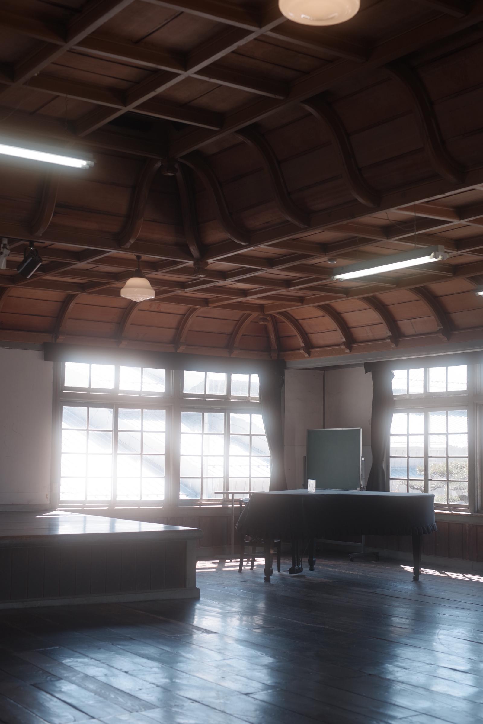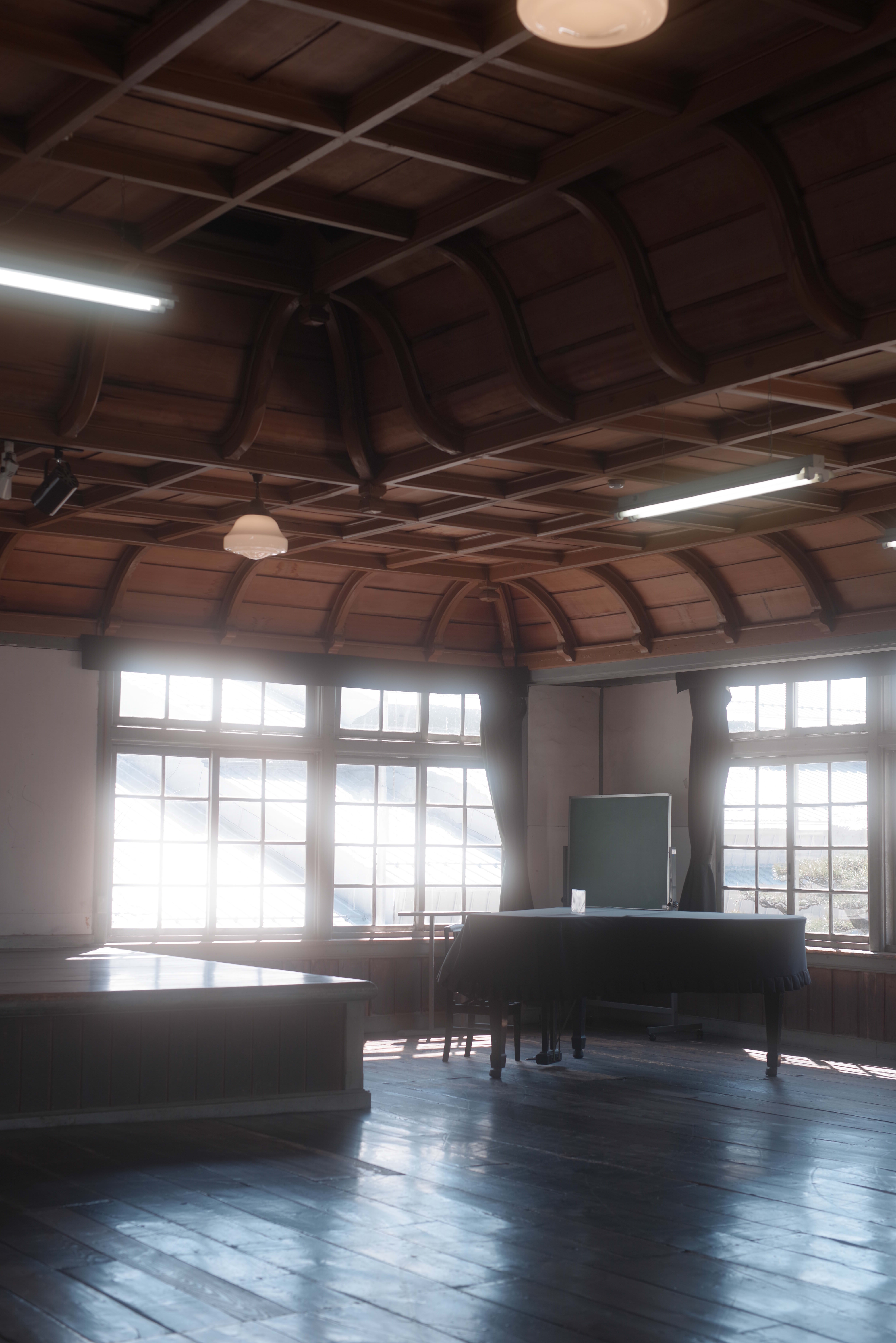旧遷喬尋常小学校の講堂の写真素材です。両側の大きな窓から自然光が差し込み、床面に光と影のパターンを作っています、茶色い格子状の天井に照明が設置され、黒板のあるステージのある広い空間で、木造建築の梁が規則正しく並ぶ構造が見えます。教育施設や歴史建築のコンテンツに最適です。