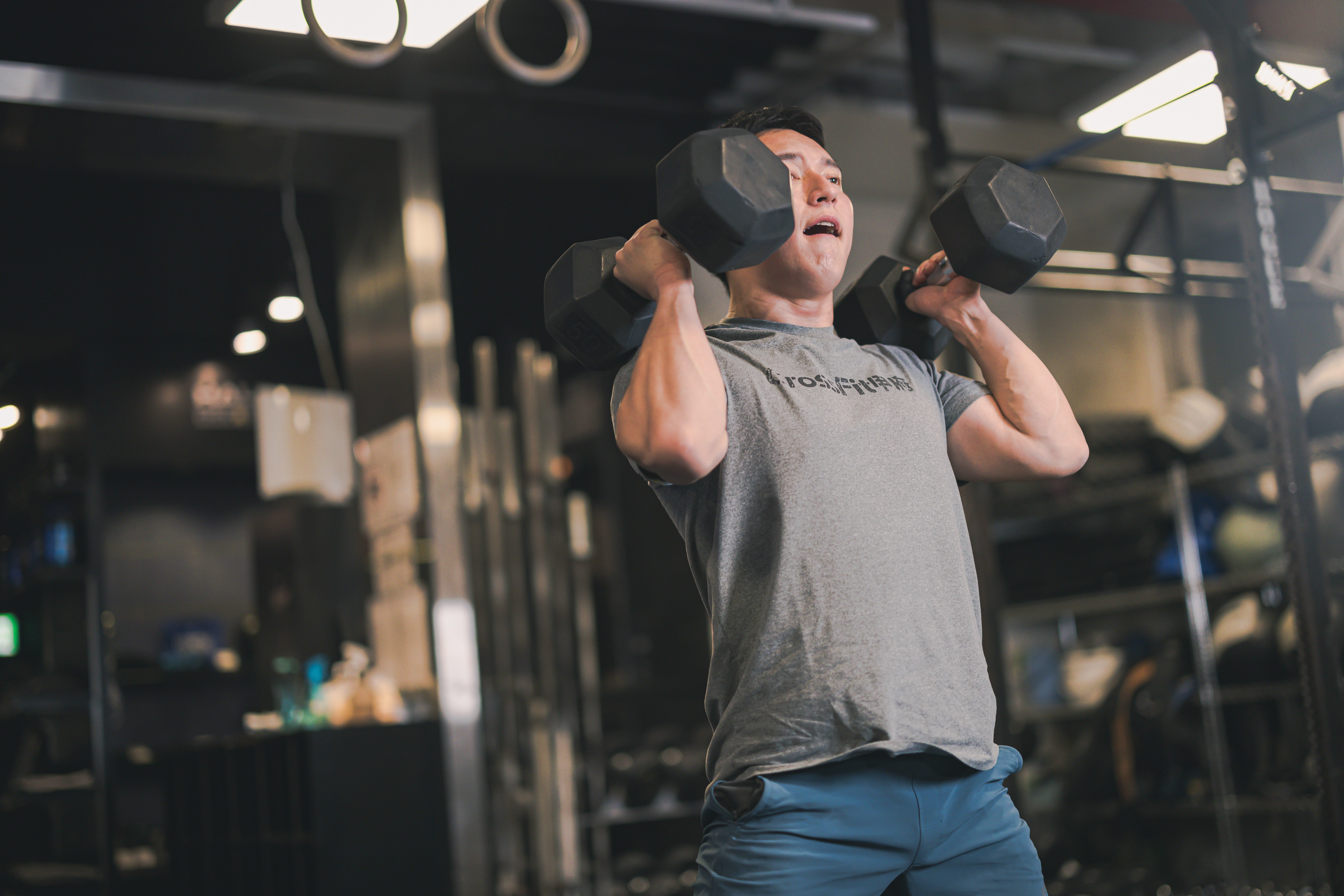 ジムでダンベルを使ったウエィトトレーニングをする男性の写真素材です。グレーのTシャツと青いパンツ姿の男性が両肩の高さでダンベルを持ち、上半身を鍛えるトレーニングに集中しており、背景にはジムの機材と照明が映り込んでいます。フィットネスやワークアウト関連のコンテンツ制作、スポーツジムの広告などにおすすめです。