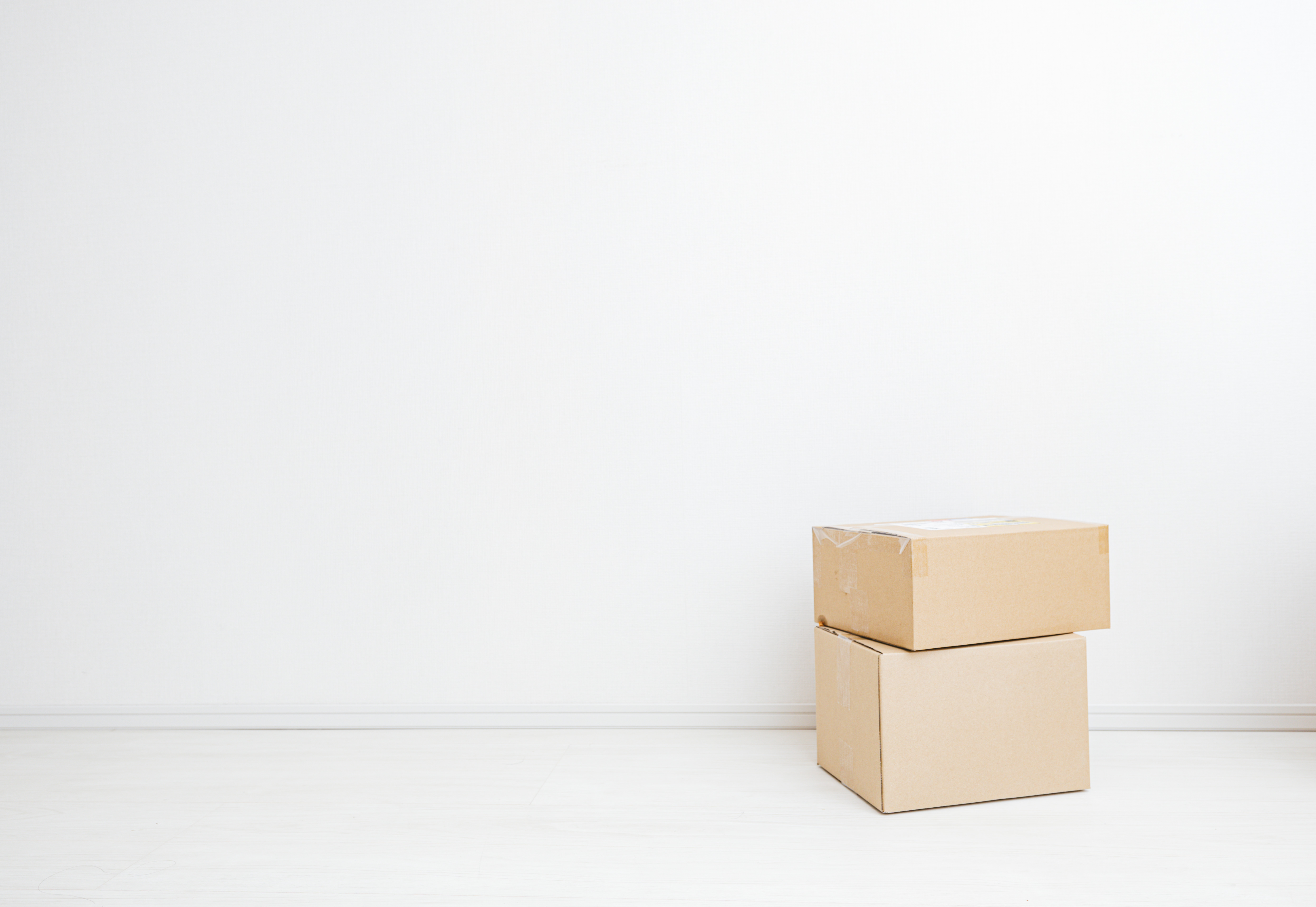 ダンボール箱がふたつ積み重なった配達の写真素材です。白い床と壁の空間に薄い色のダンボール箱が上下に重ねられ、配送状況をリアルに表現しています。オンラインショッピングや配送関連、ECサイト紹介などにおすすめです。