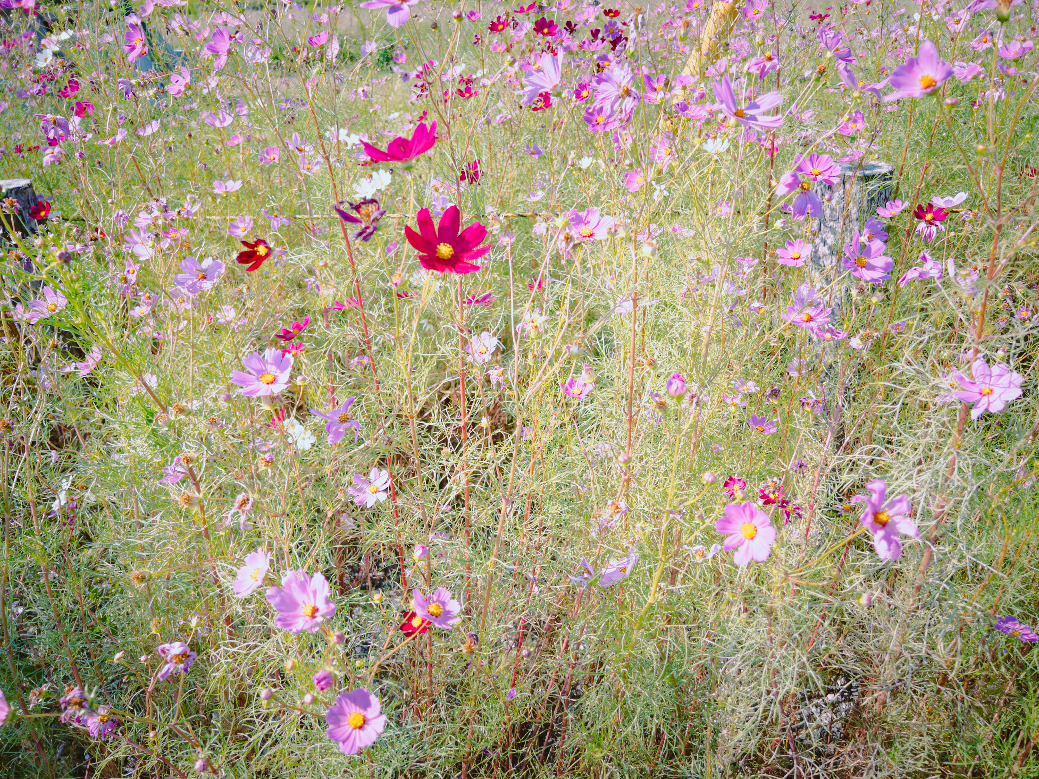 秋の路上に咲き誇るコスモスの写真素材です。ピンク、赤、白、黄色の花弁が陽光に透けて光り、細い緑の茎に密生して咲き、秋風にそよぐ優雅な姿が特徴的です。秋の季節素材や花関連のコンテンツ制作、ガーデニング企画などにおすすめです。