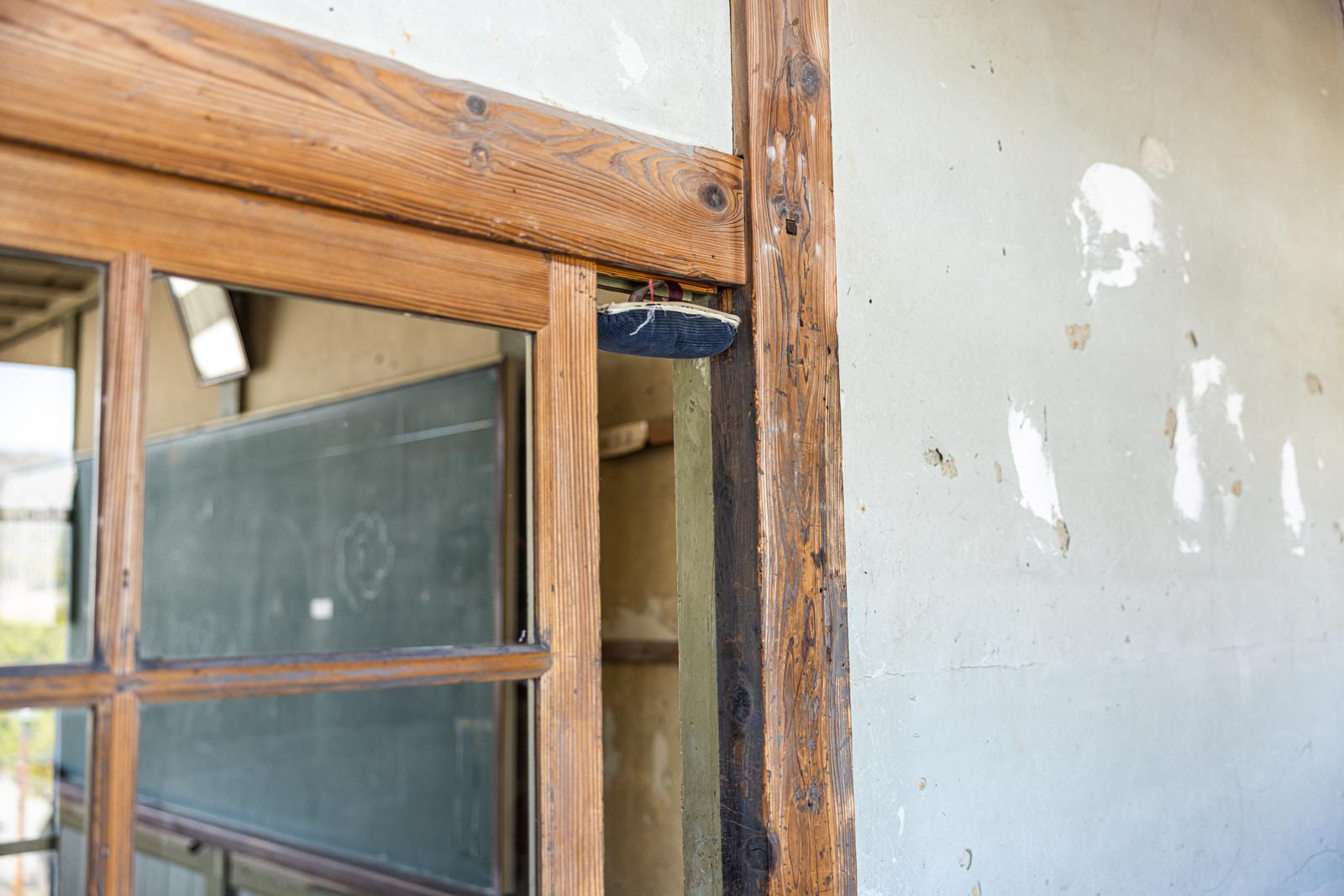 古い木製の校舎の扉上に仕掛けられた黒板消し落としのいたずらの写真素材です。茶色い太い木製の建具の上部に、紐で結ばれた紺色の黒板消しが引っかけられ、扉が開くと落ちるしくみになっています。学校の懐かしい思い出やいたずら、昭和時代の学校生活を表現するコンテンツなどに最適です。