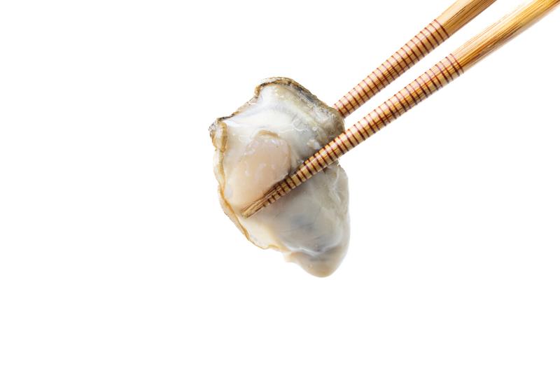 竹製の箸で摘まんだ生牡蠣の写真素材です。白く光沢のある貝柱とクリーム色の身が箸に挟まれ、貝殻には海水が残っており新鮮さが引き立ちます。和食や海鮮料理、グルメ系のコンテンツ制作などにおすすめです。